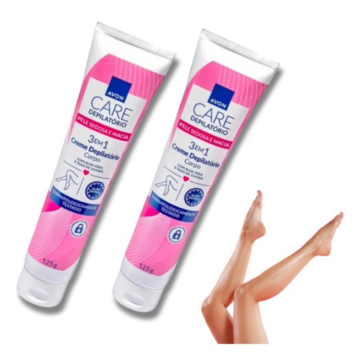 Pele lisa, macia e profundamente hidratada. Sinta a eficácia da remoção de pelos aliada ao exclusivo Complexo de Hidratação Prolongada da Avon Care. Cuidado de especialista para o seu corpo. Kit contém 2 unidades do Avon Care Creme Depilatório para o corpo 125g testado dermatologicamente idade sugerida: adulto gênero: unissex possui álcool cruelty free ocasião: à qualquer hora do dia etapa da rotina: 1 tipo de cabelo: para todos os tipos de pele textura: cremosa tipo de tratamento: depilação dicas de uso: Teste de sensibilidade: Antes de usar o creme depilatório corporal, é importante realizar o teste de sensibilidade em uma pequena área da região a ser depilada, aplicando de acordo com o modo de uso. Se após 24 horas não houver nenhuma ocorrência adversa, você poderá realizar uma depilação com segurança. Caso tenha sensação de ardor ou pinicação, remova o produto imediatamente e enxágue abundantemente a pele com água. Se a sensação persistir, consulte um médico. Não utilize sobre a pele irritada ou lesionada.Modo de uso: Indicado para pernas, axilas, braços e virilha. Não deve ser utilizado na região íntima, nas mucosas, no rosto, ou em qualquer área do corpo diferente das recomendadas. Se o pelo for grosso ou difícil de remover, antes da aplicação lave com água morna por alguns minutos e seque. Sobre a pele limpa e seca espalhe o creme em camadas espessas de forma a cobrir totalmente os pelos. Não esfregue. Deixe o creme agir por 5 minutos. Retire o creme de uma pequena área. Se os pelos não saírem com facilidade, deixe o creme agir por mais tempo. NÃO ULTRAPASSE 10 MINUTOS NO TEMPO TOTAL DE APLICAÇÃO. Não reaplique em menos de 24 horas no mesmo local. Remova o creme com ajuda de uma toalha molhada. Enxágue com água morna. Não esfregue e não use sabonete. Após o uso, é recomendado aguardar 24 horas antes de aplicar desodorantes, perfumes ou produtos perfumados, nadar, tomar sol ou realizar bronzeamento artificial. Leia atentamente o modo de uso e as precauções e realize o teste de sensibilidade antes de utilizar. PRECAUÇÕES: Seguir o modo de uso. Apenas para uso externo. Contém sais de Ácido Tioglicólico e Álcali. Não usar em crianças. Não deixar aplicado por tempo superior ao indicado no modo de uso. Não aplique o produto nas orelhas, nariz, mucosas e sobrancelhas ou em regiões a ela circunvizinhas. Não usar com a finalidade de barbear. Não aplicar o produto sobre a pele com acne ou queimada pelo sol. Não usar sobre a pele irritada ou lesionada. Se houver qualquer sinal de irritação, descontinue o uso do produto. Evitar contato com os olhos. Em caso de contato, enxaguar com água imediatamente e abundantemente e procurar um médico. Caso a irritação dos olhos e/ou pele persista, consulte um médico. Não utilize outros produtos ou soluções alcoólicas, antes ou logo após a depilação, pois poderão ocorrer irritações. Não é recomendável a reaplicação deste produto sobre uma mesma área em um período inferior a 24 horas. Para o uso durante a gravidez, consulte um médico. Evite calor excessivo. Mantenha a embalagem bem fechada e fora do alcance de crianças. A cor pode variar ao longo do período de validade, sem alterar suas propriedades. Não aplicar o produto utilizando adornos, como anéis e alianças. zona de aplicação: corpo