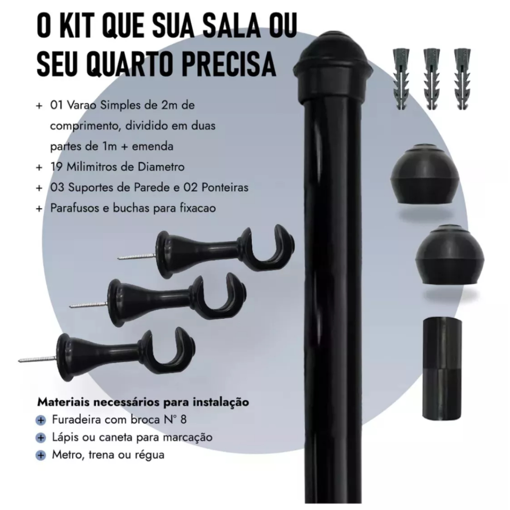 *Contém: 2 unidades do Varão para cortina com 2,00 metros de comprimento. (Escolha a cor nas Variações) Composição: Varão fabricado em Madeira resistente, garantindo qualidade e proteção a cor. Acompanha: - 2 barras de 1,00m (devido as normativas da transportadora) - 3 suportes com buchas e parafusos 8mm para instalação; - 2 ponteiras para acabamento do varão; - 1 Emenda para Junção *Disponível em várias cores. *Pratico de ser instalado. *Produto a pronta entrega. Obs.: Sempre consultar tamanho, cor e verificar se os dados para envio estão certos para agilizar o processo de preparação. Não fazemos alteração fiscal de destinatário depois de finalizado!