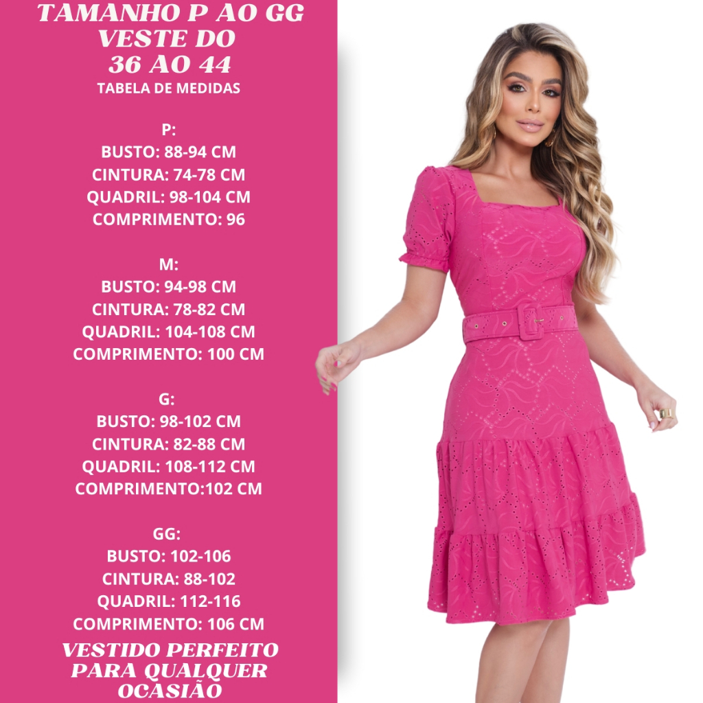ATENÇÃO, LEIA A DESCRIÇÃO ABAIXO ANTES DE REALIZAR A COMPRA. Bem vindo(a) Lethicia Fashion. Somos uma fábrica e distribuidora que atua no segmento da moda evangélica, social e executiva. Estamos a mais de 12 anos no mercado. O Vestido Alfaiataria Casual Elastano Elegante Estiloso é confeccionado em Lese Premium com elastano e forrado. A peça acompanha um lindo cinto encapado confeccionado no mesmo tecido. O modelo possui uma manga camponesa e decote quadrado, que brincam entre o estilo clássico e romântico. O tecido lese é um tipo de tecido leve e confortável, com uma textura suave e sedosa. Este vestido é perfeito para uma ampla gama de ocasiões, desde casamentos e festas formais até eventos mais casuais. Além disso, o vestido evasê é confortável de usar e pode ser facilmente combinado com sapatos, bolsas e jóias para complementar o seu look.. O tecido lese também é conhecido por sua capacidade de cair suavemente sobre o corpo, o que ajuda a criar uma aparência deslumbrante e fluida. Além disso, o tecido lese é geralmente fácil de cuidar e mantém a sua forma, mesmo após muitos usos e lavagens. Estilo: Clássico/Casual Tipo de Desenho: Elaborado Comprimento: Altura do joelho Detalhes: Acompanha cinto encapado com fivela retangular Decote: Gola quadrada Tipo de manga: Manga camponesa Comprimento da Manga: Manga curta Linha de Cintura: Regular Tecido/Material: Lese Premium Possui forro: Sim Composição Lese: 96% Poliester / 4% Elastano Forro: 100% Poliester Cores Preto Off Violeta Marsala TABELA DE MEDIDAS TAMANHO P (36/38) BUSTO 80 CM QUADRIL 88 CM CINTURA 70 CM COMPRIMENTO 96 CM TAMANHO M (38/40) BUSTO 82 CM QUADRIL 96 CM CINTURA 72 CM COMPRIMENTO 100 CM TAMANHO G (40/42) BUSTO 88 QUADRIL 102 CINTURA 78 COMPRIMENTO 102 CM TAMANHO GG (44) BUSTO 92 CM QUADRIL 108 CM CINTURA 82 CM COMPRIMENTO 106 CM * QUALQUER DÚVIDA, PEDIMOS QUE ENTRE EM CONTATO COM A NOSSA EQUIPE ATRAVÉS DO CHAT, PARA QUE POSSAMOS ESCLARECER TODAS AS SUAS DÚVIDAS COM MAIS AGILIDADE ANTES DA SUA COMPRA. * Para efetuar a sua compra, basta escolher a cor, tamanho e a quantidade e clicar em comprar agora. * Foto real do produto (pode haver uma pequena variação de tonalidade da cor de acordo com cada smartphone ou monitor). Instruções de cuidados: Lavar a mão, não alvejar, utilizar sabão neutro, secar à sombra.