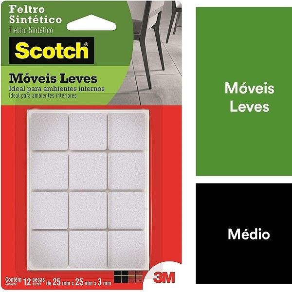 Kit com 24 feltros (2 embalagens com 24 cada) A nova linha de Feltros Sintéticos Scotch traz mais qualidade e resistência para a proteção dos móveis da sua casa, evitando riscos. Os feltros possuem alta aderência, maior vida útil e qualidade 3M. NÃO RISCA - Protege e não danifica o piso RESISTENTE - Durável AMBIENTE - Interno TAMANHO - 2,5 cm x 2,5 cm CONTEÚDO - 12 feltros sintéticos quadrados O Feltro Sintético para Móveis Leves 3M Scotch ajuda você a proteger a beleza do seu piso. Equipados com adesivo poderoso e feltro durável, os protetores de piso aderem sem esforço aos pés dos seus móveis e fornecem proteção duradoura contra riscos e arranhões. Aplicações sugeridas Mesas Cadeiras Banquetas Pufes