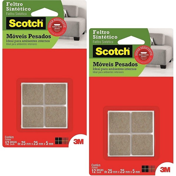 Kit com 24 feltros(2 embalagens com 12 cada). O Feltro Sintético para Móveis Pesados 3M Scotch ajuda você a proteger a beleza do seu piso. Equipados com adesivo poderoso e feltro durável, os protetores de piso aderem sem esforço aos pés dos seus móveis e fornecem proteção duradoura contra riscos e arranhões. A linha de Feltros Sintéticos Scotch traz mais qualidade e resistência para proteger os móveis da sua casa, evitando riscos e protegendo contra batidas e deslizamentos. Com fixação rápida, prática e duradoura, eles possuem alta aderência e qualidade única da 3M. São especialmente indicados para móveis pesados. A colagem dos Feltros Sintéticos Scotch é super forte. Ele não risca e está disponível em diversos formatos, para todos os móveis. É uma linha completa da 3M para proteção em sua casa ou trabalho. NÃO RISCA - Protege e não danifica o piso RESISTENTE - Durável AMBIENTE - Interno TAMANHO - 2,5 cm x 2,5 cm Aplicações sugeridas Mesas Sofás Camas Cômodas
