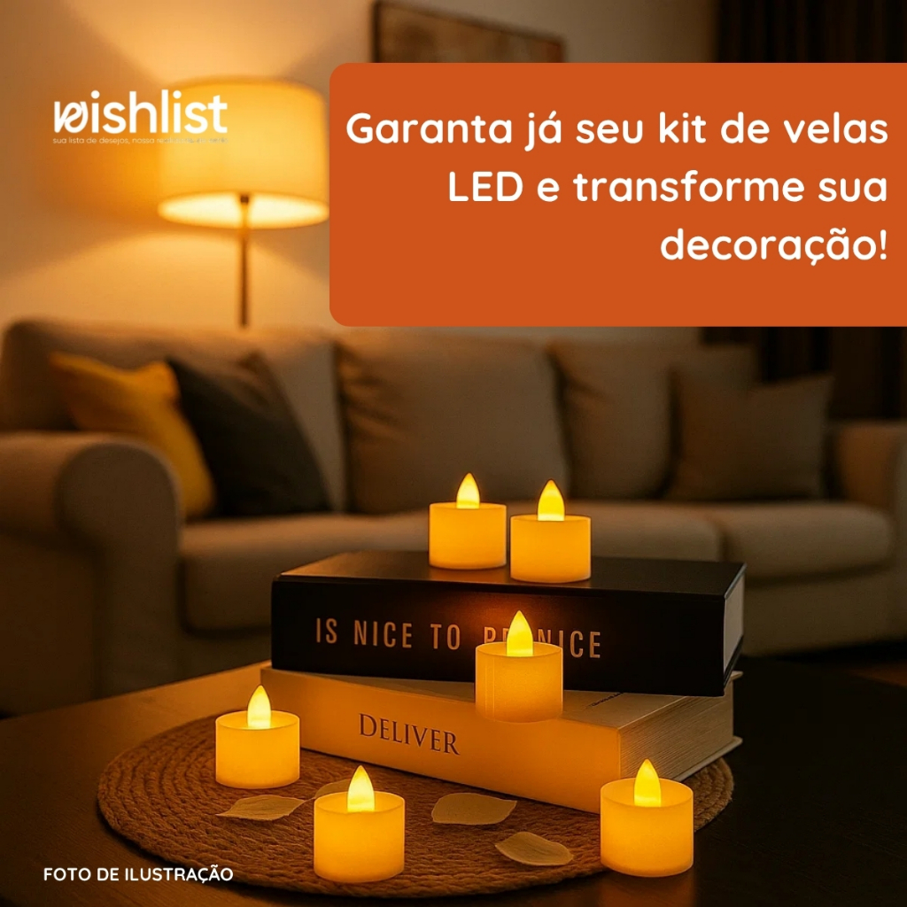 Quer criar um ambiente acolhedor e elegante com iluminação suave e sem riscos de fogo? Características do produto – Opções disponíveis: – Kit com 24 unidades - 3cm x 3,5cm – Kit com 24 unidades - 3,5cm x 4,5cm – Kit com 48 unidades - 3cm x 3,5cm – Material: Plástico resistente – Cor da vela: Branca / Cor da luz: Amarela (luz fixa) – Alimentação: 3 baterias LR41 inclusas – Controle: Botão liga/desliga individual Por que escolher este produto? – Substitui velas reais com total segurança – Ideal para festas, jantares e decorações temáticas – Luz suave que cria um clima aconchegante – Baterias inclusas e prontas para uso Dicas de uso – Distribua as velas sobre mesas, prateleiras ou trilhas de luz – Utilize em copos de vidro ou castiçais decorativos – Evite exposição direta à água Perguntas frequentes (FAQs) – As velas piscam como as reais? Não, possuem luz amarela fixa para efeito contínuo. – Posso usar ao ar livre? Sim, desde que em locais cobertos e protegidos da chuva. – É preciso trocar as baterias? Sim, quando a luz enfraquecer, substitua por LR41 novas. Adquira agora o Kit Velas Decorativas LED e transforme qualquer ambiente com charme, aconchego e segurança!