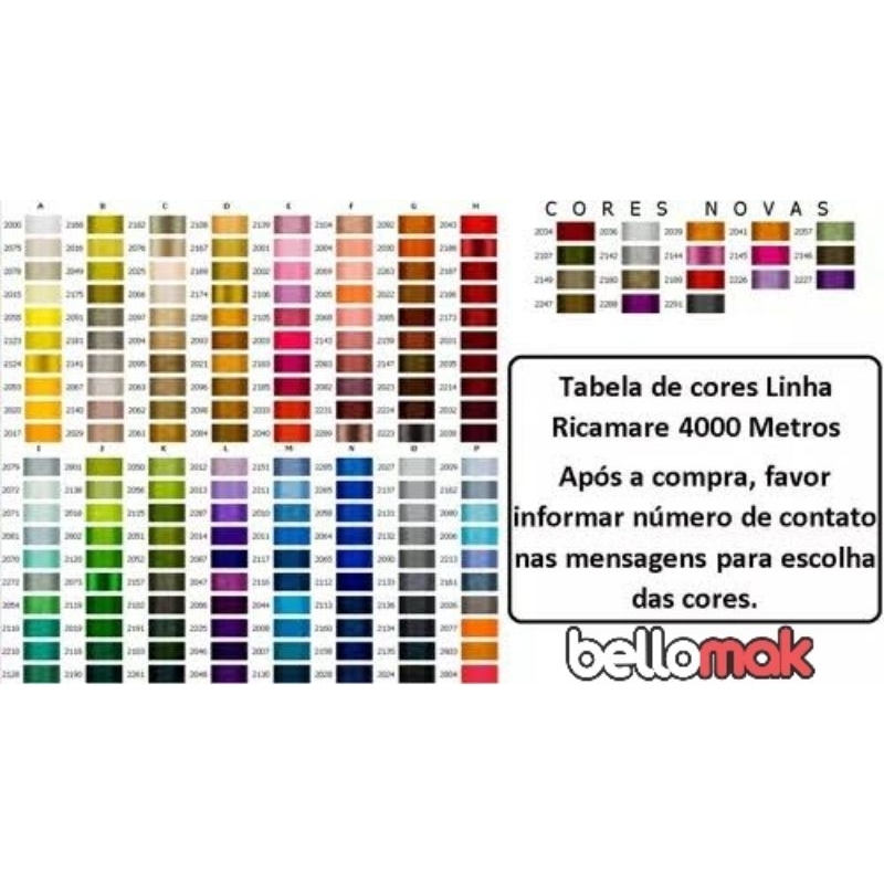 Linha para Bordado Ricamare Feita para bordados a máquina! Linha com espessura 120 100% poliéster trilobal Cone grande com 4.000 metros cada. ****************ATENÇÃO ************** ENVIE AS CORES VIA CHAT, CASO NÃO ENVIE ENVIAREMOS CORES SORTIDAS. CASO NÃO HAJA A COR DISPONÍVEL NA HORA DA COMPRA ENVIAREMOS A COR MAIS PRÓXIMA DA COR PEDIDA. Com mais de 11 anos de experiência, estamos entre os melhores vendedores do mercado online. Nossa equipe de atendimento estará SEMPRE DISPONÍVEL para te ajudar. Todos os produtos são enviados com NOTA FISCAL.