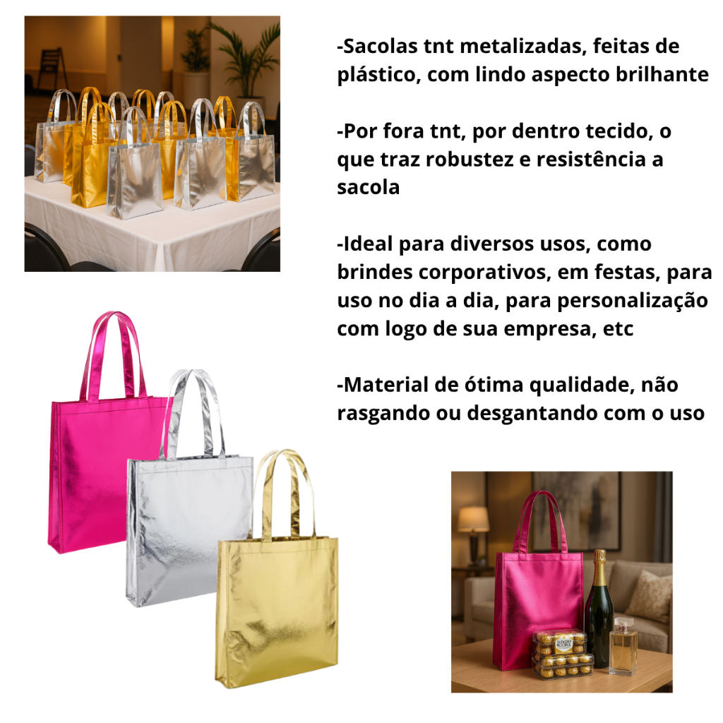 📢VENDEMOS EM DIFERENTES QUANTIDADES CASO DESEJE COMPRAR MENOS OU MAIS NO ATACADO, NOS AVISE, QUE CRIAMOS UM LINK ESPECIAL. SACOLA TNT METALIZADAS - TAM G E GG Nossas sacolas metalizadas te trazem um lindo aspecto brilhante, reforçada por dentro e com um tamanho ótimo para presentes, compras, brindes e etc! Material da sacola: TNT Material do interno: Pano Sacolas Metalizadas G: 40 x 30 x 12 cm (Altura x Comprimento x Largura) Sacolas Metalizadas GG: 45 x 36 x 12 cm (Altura x Comprimento x Largura) -Perfeito para personalização com todo tipo de material. -Ideal para presentes, lembrancinhas, brindes e produtos de loja. -Perfeita para festas, casamentos, aniversários e datas comemorativas. -Excelente para embalar cosméticos, perfumes, bijuterias, roupas e acessórios. -Pode ser usada em ações promocionais, brindes corporativos e eventos comerciais. -Facilita o empacotamento — dispensa papel de presente e fitas, deixando tudo mais prático e bonito. -Ideal para compras no supermercado !!!ATENÇÃO!!! NÃO TRABALHAMOS COM PERSONALIZAÇÃO E SUBLIMAÇÃO! IMPORTANTE: ATENÇÃO!!!!!! * APÓS A COMPRA NOS ENVIE A COR ESCOLHIDA ATRAVÉS DO CHAT QUE ENVIAREMOS CONFORME SUA PREFERÊNCIA, CASO NÃO SEJA ENVIADO NADA OS PRODUTOS SÃO ENVIADOS DE MANEIRA ALEATORIA*** ✅ Produto com Nota Fiscal eletrônica (NFe) ⏱ Envio rápido: Despachamos em até 24 horas úteis 🛡 Garantia: 1 mês assegurada diretamente pelo site 📞 Dúvidas? Fale conosco pelo site! Estamos à disposição para te ajudar. ... SOBRE NÓS: 🎁 Há mais de 3 anos levando praticidade e carinho até você! Aqui você encontra de tudo um pouco: utilidades domésticas, brinquedos, itens de higiene pessoal e o nosso carro-chefe — embalagens de presente lindas e criativas para deixar qualquer mimo ainda mais especial.