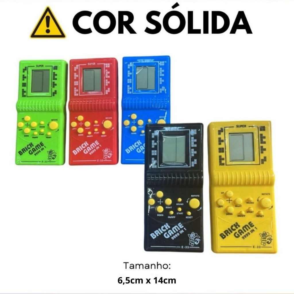 *** NÃO ACOMPANHA PILHA *** KIT COM 25 UNIDADES DO SUPER MINI GAME QUE TAL RELEMBRAR OS VELHOS TEMPOS? A MODA VOLTOU COM TUDO E VAI SER UMA DIVERSÃO PARA TODA FAMÍLIA. COM CLÁSSICOS COMO TETRIS, JOGO DA COBRINHA, ENTRE OUTROS!!!! SÃO 9999 JOGOS EM APENAS 1 BRINQUEDO. Várias funções, como: - Opção pra pausar o jogo - Opção para deixar o som no mudo ou vice-versa - Opção de Reset - Possuindo controles macios e sensíveis ao toque, ele traz o melhor da tecnologia para que não haja interrupções em suas jogatinas. INSTRUÇÕES ADICIONAIS: - Aperte a tecla ON/OFF para ligar e desligar. - Use as teclas Level, mode, speed, para escolher entre níveis, modos e velocidades do jogo. - Pressione Start para iniciar o jogo. - Antes de iniciar o jogo, as pontuações são mostradas. - Sound: definir o modo de som. - Mode: alterar o modo de jogo. - Level: muda o nível do jogo. - Speed: velocidade da queda Em caso de dúvidas, por favor, entre em contato conosco através do chat. Em caso de problemas no fornecimento, por favor, entre em contato através do link do seu pedido. Somos o GRUPO BCIM, e postamos seu pedido em até 24 horas. Contem com a gente =) *** NÃO ACOMPANHA PILHA ***