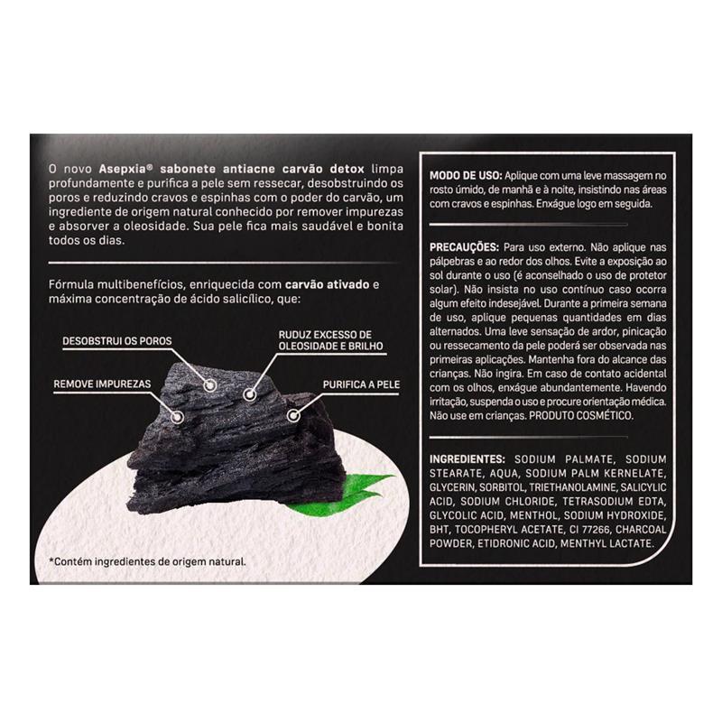 O peso líquido do conteúdo é de 80g. O Asepxia Sabonete Facial Detox purifica a pele, remove impurezas sem ressecá-la, reduz a oleosidade e brilho da pele e combate e ajuda a prevenir cravos e espinhas. Feito para pele mista ou oleosa, o Asepxia Sabonete Detox limpa profundamente sua pele, reduz e controla a oleosidade, e desobstrui os poros. Nossa tecnologia foi criada para controlar a oleosidade, desobstruir os poros e combater os cravos, deixando a pele mais lisa e sequinha. O Asepxia Sabonete Esfoliante é perfeito para uma limpeza de pele profunda. Combate os cravos com uma simples esfoliação do rosto. Modo de Uso: Aplique com uma leve massagem no rosto úmido, de manhã e à noite, insistindo nas áreas mais oleosas ou com cravos e espinhas. Enxágue logo em seguida.