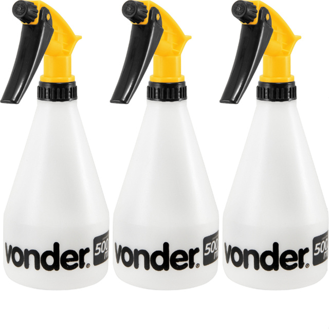 Kit com 3 Pulverizador 500 ml - VONDER - Marca: VONDER - Tipo do pulverizador: Doméstico - Capacidade do reservatório: 500ml - Sistema de acionamento: Gatilho Manual Contem na embalagem: - 1 Pulverizador Vonder 500mL Manual com jato regulável - Para regular a vazão do jato, basta girar a tampinha preta no bico do borrifador. - Após adicionar o líquido, evite virar o borrifador para baixo para evitar derramar pelo encaixe do gatilho. - Como a boca do recipiente e encaixe do gatilho possui rosca, é possível utilizar fita veda rosca para aumentar a vedação. Pulverizador Borrifador Manual VONDER 500ml Bico Com Jato Regulável Branco *NÃO ACEITA PRODUTOS CORROSIVOS *NÃO VIRAR O PRODUTO DE PONTA CABEÇA, POIS DESSA FORMA CORRE O RISCO DO LÍQUIDO VAZAR.
