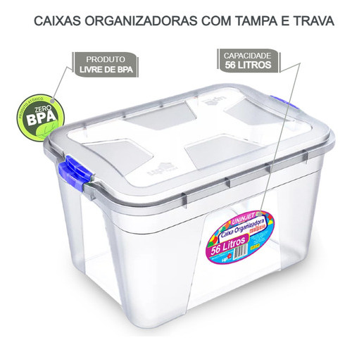 Kit 3 Caixa Organizadora Multiuso Transparente 56 Litros Com Tampa Se você está procurando uma solução de armazenamento confiável e durável para manter seus pertences organizados e protegidos, a Caixa Organizadora e de Armazenamento Com Tampa e Trava de Proteção 56 litros da Uninjet é a escolha perfeita para você. Com sua grande capacidade e segurança reforçada, esta caixa é ideal para armazenar uma ampla variedade de itens, incluindo roupas, livros, brinquedos e ferramentas, e pode ser usada em qualquer ambiente da casa, desde quartos e banheiros até lavanderias e escritórios. A seguir, vamos explorar algumas das características e benefícios que fazem da Caixa Organizadora Uninjet uma escolha inteligente para quem busca praticidade, organização e qualidade. *Observação : ATENÇÃO! AS TRAVAS SÃO ENVIADAS EM CORES ALEATÓRIAS, NÃO TEM COMO ESCOLHER A COR!* • Capacidade de 56 litros: Com uma capacidade de 56 litros, esta caixa oferece espaço de sobra para guardar seus pertences de forma organizada e segura. • Tampa e trava de proteção: A tampa e a trava de proteção reforçada ajudam a manter os itens armazenados seguros e protegidos contra poeira, sujeira, umidade e até mesmo animais de estimação curiosos. • Design elegante e discreto: Com seu acabamento transparente, elegante e discreto, esta caixa é capaz de se integrar perfeitamente em qualquer ambiente da casa, sem comprometer a estética do espaço. • Fabricação de alta qualidade: Fabricada com materiais de alta qualidade, esta caixa é resistente e durável, oferecendo anos de uso confiável e sem problemas. As Caixas Organizadoras com Tampa e Trava Uninjet são ideais para auxiliar na organização de todos os ambientes do seu lar, quartos, banheiros, lavanderias, escritórios, deixando tudo mais bonito e harmonioso. • Produto atóxico e livre de BPA. Medidas : • Comprimento : 58cm • Largura : 40cm • Altura : 34cm Contem : • (03) Caixas Organizadoras Multiuso Transparente.