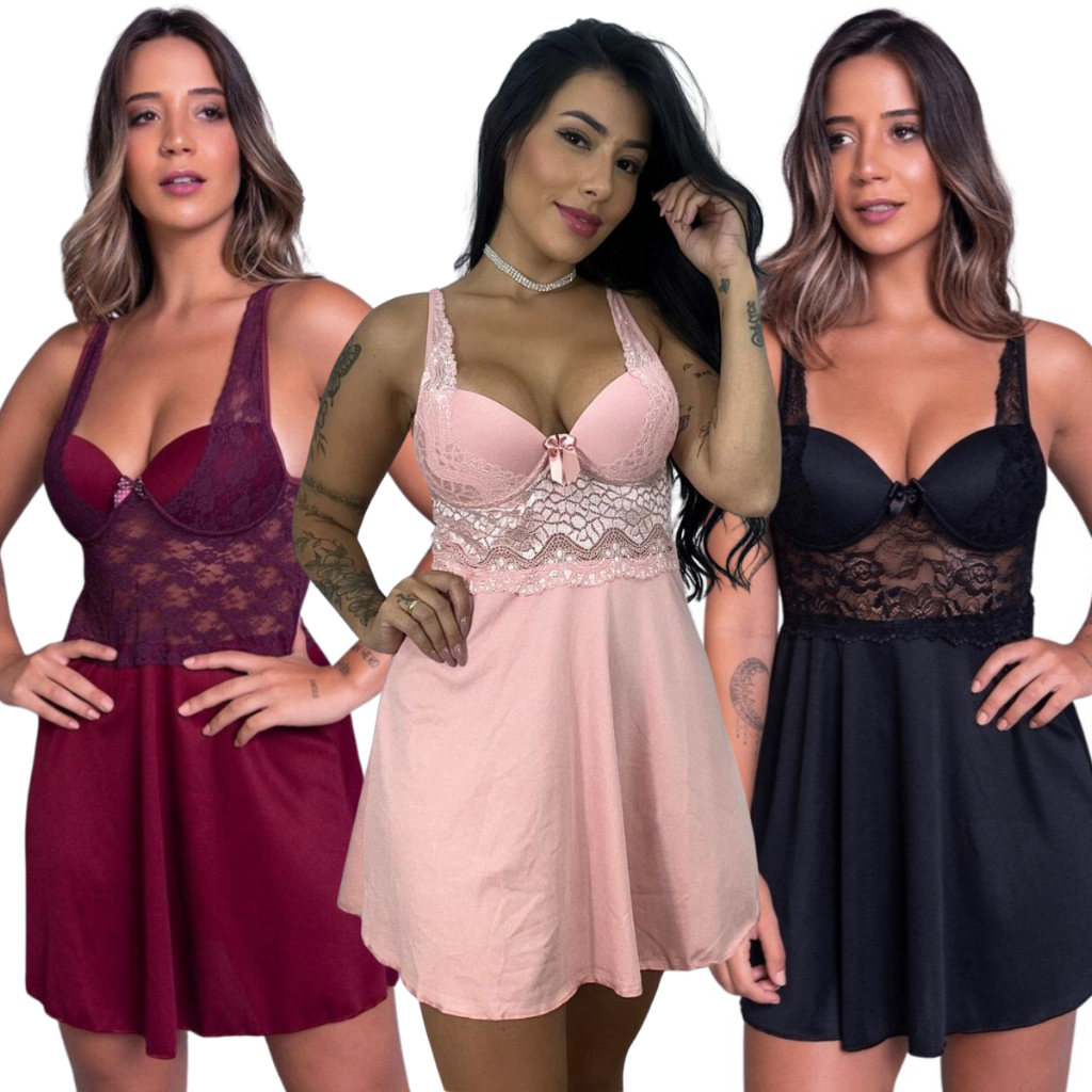 Kit com 3 Camisola de Bojo Feminina Soltinha Renda Moda Lingerie Adulto Dormir