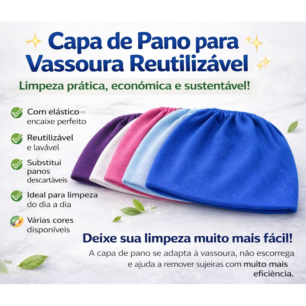Kit 3 Capas para Vassoura em TNT – Limpeza Prática e Ágil! Cansou de lutar contra o pó que levanta na hora de varrer ou de ter que abaixar toda hora para torcer panos de chão convencionais? Nosso Kit com 3 Capas de TNT é a solução inteligente que faltava na sua rotina! Desenvolvidas para se ajustarem perfeitamente à sua vassoura ou rodo, essas capas transformam sua ferramenta de limpeza em um "mop" eficiente, capturando a sujeira de primeira e dando aquele brilho no piso. --------------------- Por que escolher o nosso Kit? - Material em TNT de Alta Qualidade: Tecido leve, com excelente aderência para poeira, pelos de pets e cabelos. - Super Absorvente: Ideal para secar superfícies rapidamente ou aplicar produtos de limpeza de forma uniforme. - Limpeza 2 em 1: Varra e passe pano simultaneamente. Economize tempo e esforço físico! - Ajuste Universal: Possui elástico/cordão de ajuste que fixa com firmeza em diferentes tamanhos de vassouras e rodos (não escorrega durante o uso). - Reutilizável e Prático: Fácil de lavar e com secagem ultra rápida. --------------------- Ficha Técnica: - Material: TNT (Tecido Não Tecido) resistente. - Quantidade: 03 unidades (Cores enviadas conforme disponibilidade de estoque). - Indicação: Pisos frios, laminados, porcelanatos e madeiras. - Função: Limpeza seca (retirar pó) ou úmida (passar desinfetante/lustra móveis). --------------------- Dica de Uso: Use uma capa seca para "varrer" a casa e atrair o pó por estática, e outra levemente umedecida com seu limpador favorito para finalizar o brilho. Adeus baldes pesados e panos que caem do rodo! --------------------- O que vem no pacote? 03 Capas Protetoras para Vassoura em TNT. --------------------- ️ Garanta já o seu kit e transforme a faxina pesada em uma tarefa simples e rápida!