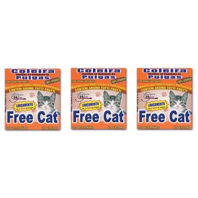 DESCRIÇÃO; KIT CONTENDO 3 COLEIRAS FREE CAT. REPELENTE NATURAL ERVAS *FABRICAÇÃO APENAS VERMELHO Coleira anti pulgas free cat desenvolvida especialmente para gatos adultos este produto é 100% ATÓXICO. Recomenda-se o uso permanente em gatos para auxiliar no combate as pulgas. A coleira para gatos pode ser usada a partir do 3° mês de vida. Nã há necessidade de retirar a coleira na hora de banhar o pet. Seu efeito perdura normalmente por cerca de até 90 dias, para melhor desempenho da coleira, manter o local onde fica seu pet bem higienizado. Modo de Usar; Somente abrir a embalagem da coleira no momento do uso para assim, potencializar o efeito. Colocar a coleira no pescoço do gato sem apertar demasiadamente. Havendo necessidade, cortar o excedente.Composição: PVC Atóxico D.65 Flexível Aroma Artificial de Tutti Frutti Extrato de Ervas Naturais.36 cm comprimento Duração: 3 meses