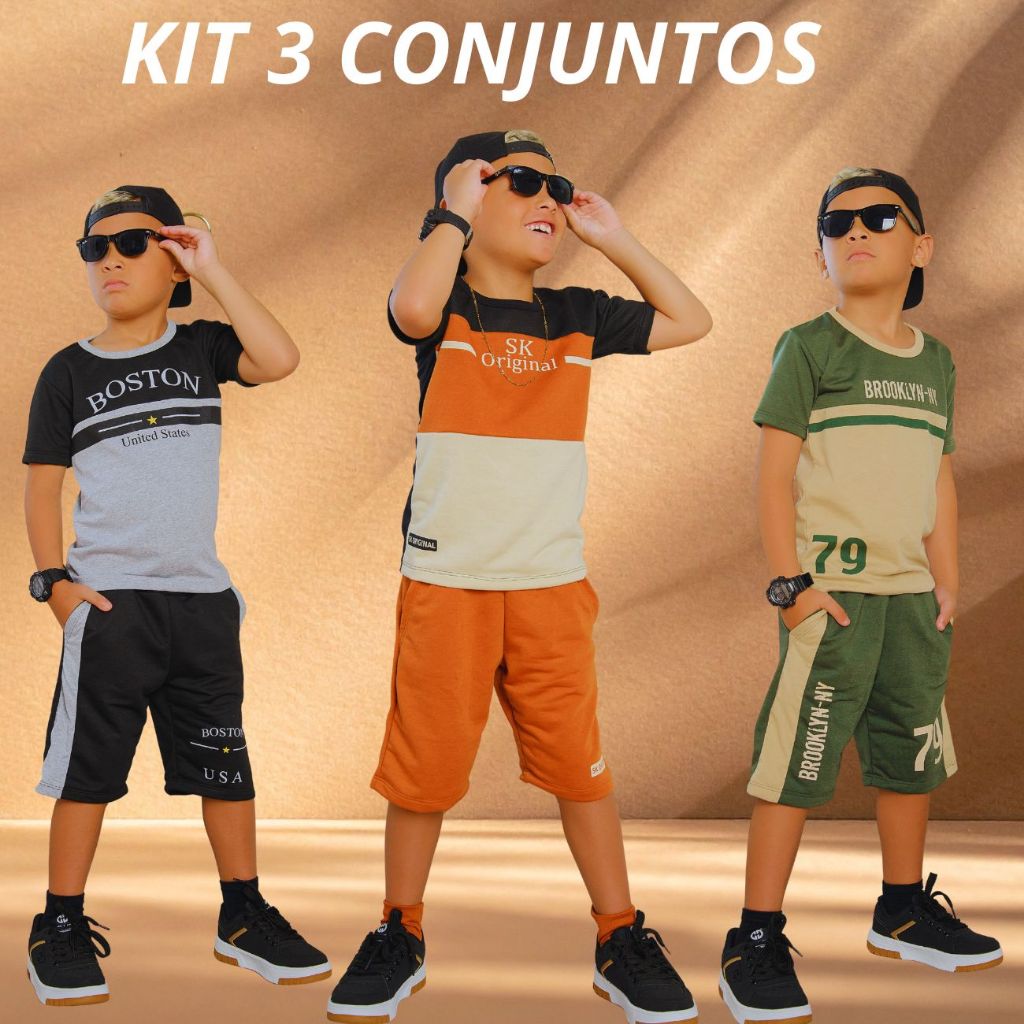 Kit Com 3 Conjuntos infantil Juvenil Lançamento Verão Roupa de menino Camisa e Bermuda 2 ao 14 Anos