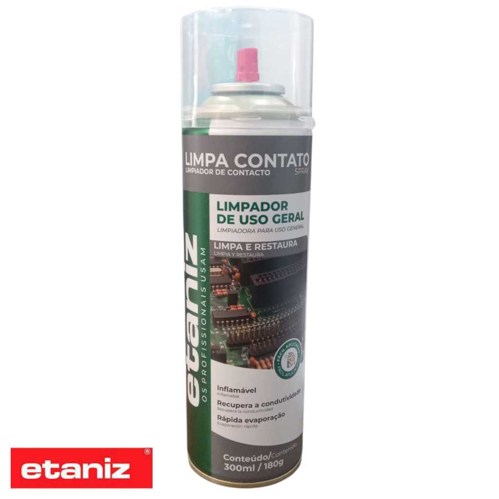 LEV&UZE LIMPA CONTATO SPRAY 300ML/200G É UM PRODUTO DE FÁCIL APLICAÇÃO E RÁPIDA EVAPORAÇÃO, LIMPA E REMOVA GRAXA, PÓ, FLUXO DE SOLDA E UMIDADE. APÓS APLICAÇÃO NÇAO DEIXA RESÍDUO E NEM OLEOSIDADE. INDICADO PARA LIMPEZA GERAL DE COMPONENTES ELETRÔNICOS , PLACAS E CIRCUITOS IMPRESSOS, LIMPEZA DE COMPONENTES ELÉTRICOS DE MOTORES AUTOMOTIVOS IGNIÇÃO ELÉTRICA. NÃO ATACA A MAIORIA DOS PLÁSTICOS, VERNIZES DE ISOLAMENTO, BORRACHAS E VEDAÇÕES. APLICAÇÃO: LIMPEZA GERAL DE COMPONENTES ELÉTRÔNICOS , PLACAS E CIRCUITOS IMPRESSOS E DE MOTORES AUTOMOTIVOS. INSTRUÇÕES DE USO: AGITE BEM O FRASCO, DESLIGUE O EQUIPAMENTO E APLIQUE O PRODUTO NOS LOCAIS E PEÇAS A SEREM LIMPAS, A UMA DISTÂNCIA APROXIMADA DE 5 A 10 CM.