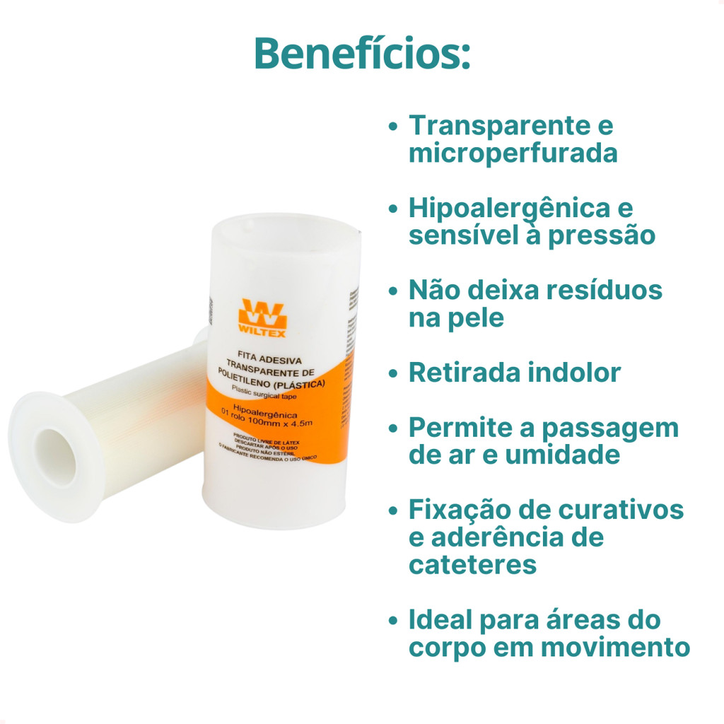 Seja bem-vindo(a)! Fita Médica Adesiva Transparente Microperfurada Tipo Transpore Wiltex 100mmX4,5m A Fita adesiva Wiltex é ideal para fixação de curativos, cateteres e sondas. Características - Transparente e microperfurada - Hipoalergênica e sensível à pressão - Não deixa resíduos na pele - Retirada indolor - Permite a passagem de ar e umidade Indicações - Fixação de curativos e aderência de cateteres - Ideal para áreas do corpo em movimento Vantagens - Excelente flexibilidade - Permite a observação da área de aplicação - Fácil corte em ambas as direções Modo de Uso - Aplicação da fita: limpe a lesão e prepare a área, aplique a fita com compressão suave - Remoção da fita: soltar a borda da fita, remover lentamente na direção do crescimento do pelo Especificações Técnicas - Apresentação em rolo com 100mm de largura e 4,5m de comprimento - Material: polietileno (PE) microperfurado com adesivo acrílico - Não estéril - Registro ANVISA: 10150470602 QUEM SOMOS? Desde 1990 atuamos com foco em licitações públicas para atendimento a hospitais e clínicas médicas do ES. Somos reconhecidos pelos setores público e privado como um dos melhores e mais eficientes distribuidores de produtos hospitalares, afinal, estamos presente nos 78 municípios capixabas, na Secretaria da Saúde Estadual e em mais de 800 clientes da rede privada incluindo também empresas de Remoção, Home Care, Clínicas Odontológicas, Dentais, Distribuidores, Drogarias, Clínicas Veterinárias, dentre outros.