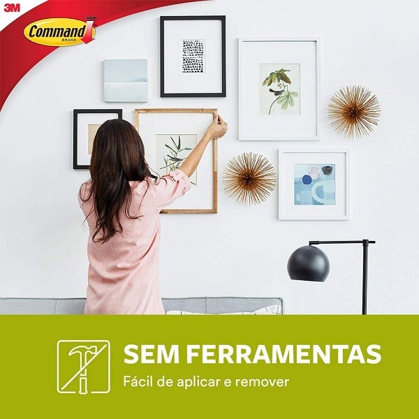 Kit com 3 ganchos. FIRME E SEGURO - Suporta até 2,3 kg SEM FERRAMENTAS - Fácil de aplicar e remover REMOVÍVEL SEM ESTRAGOS - Ao ser removido não deixa adesivo nem danifica a parede CONTEÚDO DE CADA EMBALAGEM - 1 Suporte Grande e 2 Tiras Adesivas O Suporte Adesivo para Quadros 3M Command é a solução ideal para pendurar quadros e decorar a casa de forma prática, sem sujeira e sem furos na parede. Faça você mesmo em minutos e remova quando quiser, sem estragar sua parede. Aplicação forte, remoção limpa, resultados sem danos na parede O Suporte para Quadros Command pode ser aplicado em várias superfícies. É indicado para que você realize uma decoração fácil e rápida sem causar danos na parede. Cada embalagem contém um suporte com dois adesivos médios. Esse produto suporta até 2,3kg.
