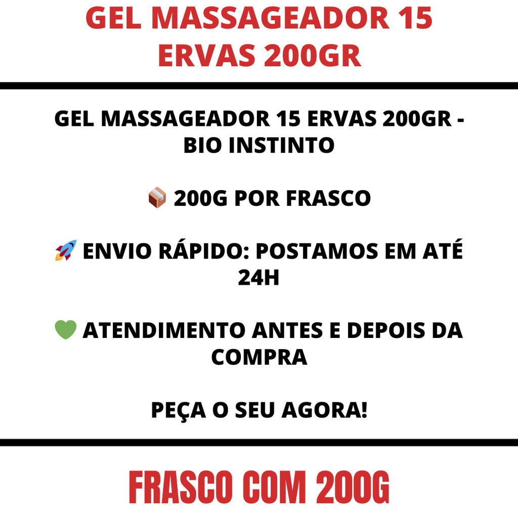 Gel Massageador 15 Ervas Com Sebo de Carneiro - Bio Instinto 200g O Gel Massageador 15 Ervas foi desenvolvido com extratos vegetais amplamente utilizados em cosméticos, proporcionando uma sensação agradável de conforto e bem-estar durante a massagem. Ideal para momentos de autocuidado após a rotina diária, atividades intensas ou simplesmente para relaxar com uma boa massagem. Sua textura leve facilita a aplicação e a absorção pela pele, sem deixar sensação pegajosa. 🌱 DIFERENCIAIS DO PRODUTO: • Com combinação de extratos de ervas tradicionais • Sensação refrescante e confortável na pele • Textura leve e fácil de espalhar • Perfeito para massagens localizadas Uso diário 🧴 MODO DE USO: Aplique uma quantidade suficiente do Gel 15 Ervas sobre a pele e massageie suavemente até completa absorção. Não é necessário enxágue. 📦 CONTEÚDO DO KIT: ✔️ 3 unidades de Gel Massageador 15 Ervas ✔️ Produto autêntico e confiável ✔️ Atendimento atencioso antes e depois da compra ✔️ Postagem rápida: enviamos em até 24h Produto cosmético de uso externo. Ideal para quem busca conforto, cuidado e um momento relaxante na rotina. 💚
