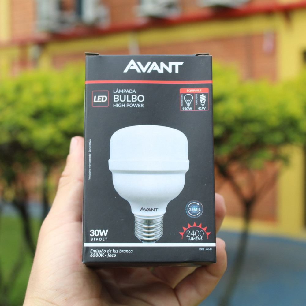 O que você estará adquirindo 3 Lâmpada LED Bulbo High Power Avant 30W – Luz Branca 6500K 3 Embalagem original do fabricante 1 Manual/Informações impressas na caixa Descrição do Produto A Lâmpada LED Bulbo High Power Avant 30W entrega alta luminosidade, economia e durabilidade para ambientes que exigem iluminação forte e uniforme. Com emissão de 2400 lúmens e luz branca 6500K, é ideal para residências, comércios e espaços que necessitam de claridade intensa. Seu driver é incorporado e eletricamente isolado, permitindo ligação direta na rede 127V ou 220V sem necessidade de transformador. A estrutura com base metálica em alumínio e bulbo em plástico proporciona maior dissipação de calor e vida útil prolongada. Equivale a lâmpadas incandescentes de 150W, oferecendo alta eficiência com baixo consumo. Características Principais Potência: 30W Fluxo luminoso: 2400 lúmens Temperatura de cor: 6500K – Luz branca Tensão: Bivolt automático (127V / 220V) Eficiência luminosa: 80 lm/W IRC: >80 Ângulo de abertura: 180° Não dimerizável Vida útil: 25.000 horas Driver incorporado eletricamente isolado Uso recomendado: Ambientes internos e secos Instalar em luminárias que dissipem bem o calor Não utilizar com dimmers ou luminárias totalmente fechadas Especificações Técnicas: Tensão nominal: 100V – 240V Corrente nominal: • 127V ? 150mA • 220V ? 85mA Fator de potência: >0,92 Frequência: 50–60Hz Base: E27 Material: • Corpo em alumínio • Bulbo em plástico Equivalência: • Incandescente 150W • Fluorescente 41W Peso: 50g Dimensões da Lâmpada Altura total: 112 mm Diâmetro: 70 mm kit2767 Garantia 12 meses de garantia do fabricante contra defeitos de fabricação.