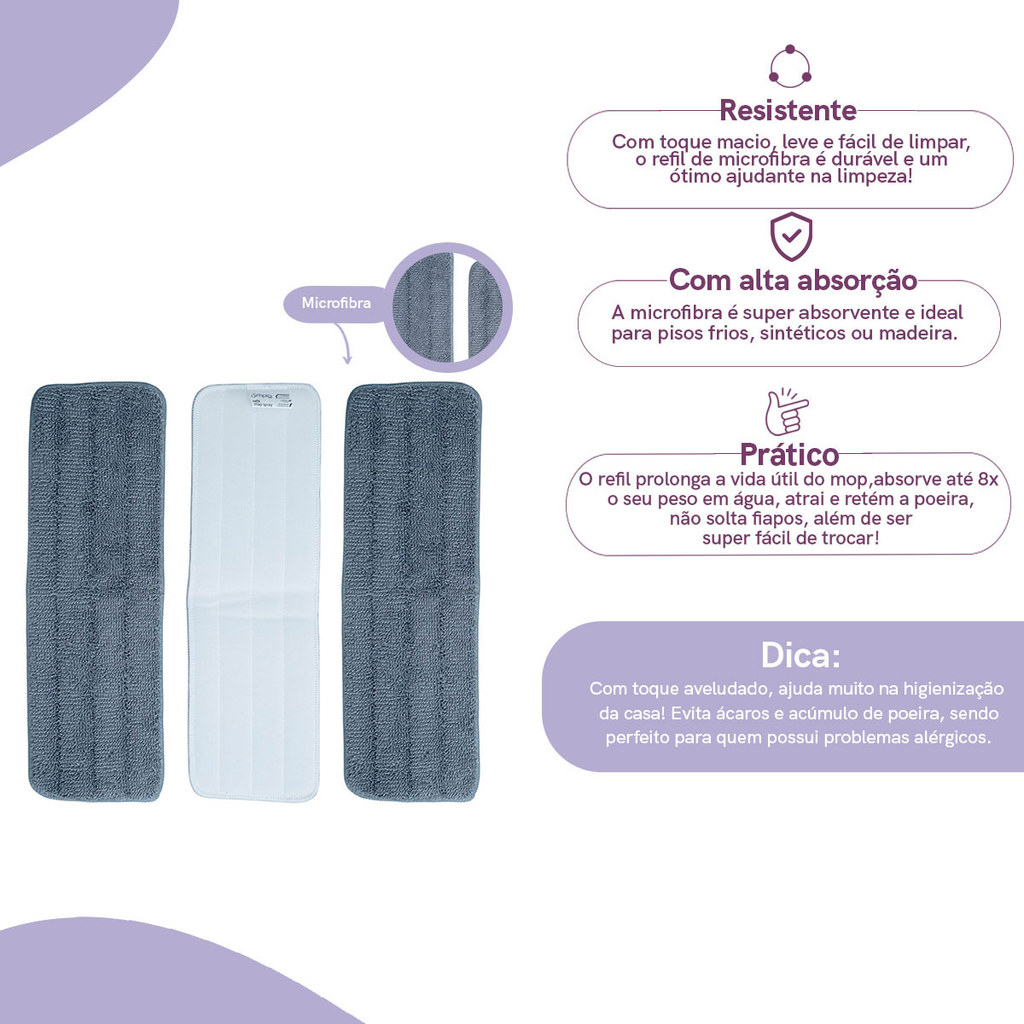 Conheça o Kit com 3 panos de microfibra para mop spray da Simplo. Resistente e com alta absorção, é ideal para pisos frios, sintéticos ou madeira. Prolonga a vida útil do mop, absorve até 8x o seu peso em água, atrai e retém a poeira, não solta fiapos, além de ser super fácil de trocar! É 100% de microfibra. Para limpar, pode colocar em máquina de lavar. - Deixar no sol ou perto de outras fontes de calor. A temperatura máxima de lavagem é de 40°C! Não deixe perto de fontes de calor, não passe ou utilize secadora e não use alvejante. Leve funcionalidade e modernidade para sua casa! O kit contém: 3 Refis para mop spray