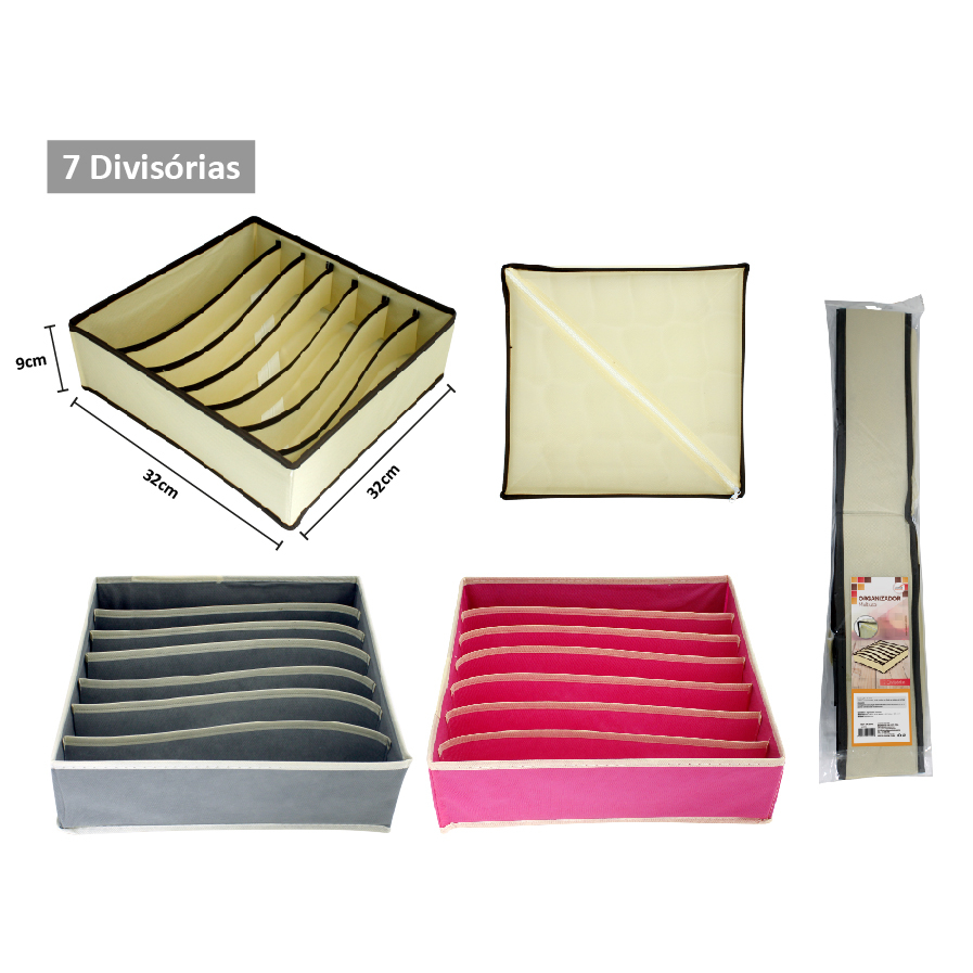 BEM VINDOS A SHOP HILL Kit Com 3 Organizadores De 7 divisórias Lindos Organizadores multiuso flexível para closet, armários, gavetas, que facilita a visualização do interior, ideal para manter suas meias, roupas intimas sempre protegidas e prontas para uso, é uma das melhores maneiras de ganhar muito mais espaço e ter um guarda roupa sempre organizado. O tecido dos organizadores é extremamente durável e maleável. Por fim, os organizadores são dobráveis o que facilita o armazenamento e o transporte da mesma. Benefícios: - Ideal para guardar suas roupas íntimas e encontrá-las facilmente quando precisar. - Totalmente dobrável sendo fácil de guardar quando não utilizada - Suas bordas são reforçadas o que permite ser empilhadas ou colocadas em prateleiras. - Se encaixa perfeitamente em gavetas e armários - A parte de baixo do organizador possui zíper para quando desmontado ele fique compacto e fácil de transportar. Características: Material: 100% TNT Cores: Bege, Rosa e Cinza Medidas: 32x32x9cm Desejamos boas compras a você! 📦⚡ ENVIO RÁPIDO APÓS CONFIRMAÇÃO DE PAGAMENTO ⚡📦