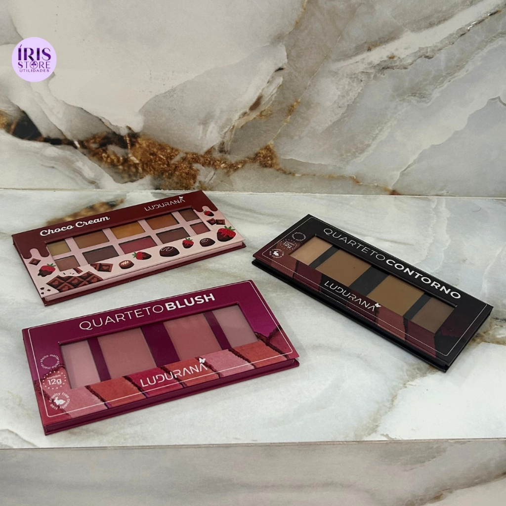 🌟 Quarteto de Contorno 🌟 Com uma fórmula inovadora e cores deslumbrantes, ele vai te ajudar a destacar e definir seus traços de forma fácil e natural. Perfeito para quem busca um acabamento impecável e de longa duração. 🌸 Quarteto de Blush 🌸 Aposte no toque de cor perfeito para seu rosto com o Quarteto de Blush da Ludurana! São 4 tons incríveis que garantem um efeito natural e radiante, ideal para realçar todos os tipos de pele. Com ótima pigmentação e acabamento impecável, você vai conquistar um look fresco e saudável para qualquer ocasião. 🍫✨ Paleta de Sombras ✨🍫 A paleta de sombras Choco Cream da Ludurana chegou para deixar o seu olhar irresistível! Com tons quentes e cremosos, ela oferece uma combinação perfeita de sombras matte e brilhantes, ideais para criar desde maquiagens discretas até as mais ousadas.