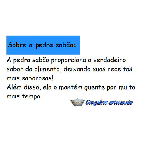 | Kit Com 3 Panelas De Pedra Curadas 1,5 - 2lts e 2,5lts este produto | R$ 367,75 | — | 5.0/5 | — |