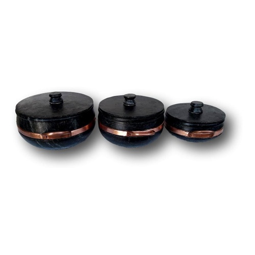 Três panelas de pedra curadas prontas para uso com alça de cobre , sendo: Uma panela de 1,500ml Uma panelas de 2,0lts e Uma panela de 2.500 ml Panelas de qualidade, conservam alimentos quente por muito tempo, não slteram cor nem sabor dos alimentos ,mais saudáveis,fácil de lavar e muito decorativas.