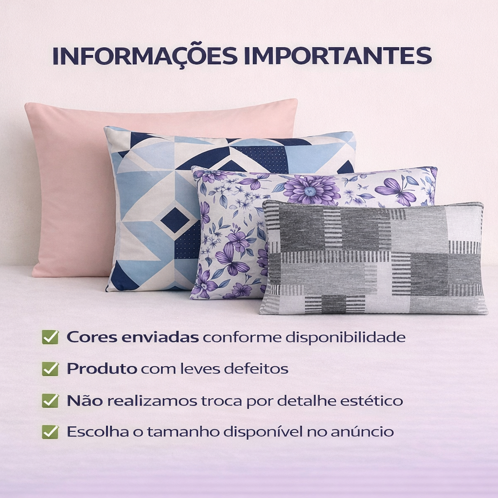 🛏 KIT COM 3 PARES DE FRONHAS – LINHA OPORTUNIDADE COM LEVES DEFEITOS Somos fábrica e estamos disponibilizando um lote especial de fronhas com leves defeitos estéticos, por valor promocional. Uma excelente oportunidade para renovar o enxoval pagando menos. 📦 O QUE VOCÊ RECEBE: ✔ Kit com 3 PARES de Fronhas (6 unidades) ✔ Modelo Envelope ✔ Cores e estampas enviadas de forma sortida conforme disponibilidade ✔ Escolha o tamanho disponível no anúncio 📏 MEDIDAS: 📐 50cm x 70cm + aba envelope (Verifique o tamanho disponível no anúncio antes de finalizar a compra.) 🧵 COMPOSIÇÃO DO TECIDO: ✔ Malha 100% Poliéster ✔ Gramatura 135 ✔ Fio 30/1 PP Vortex Tecido resistente, macio e com tecnologia que não forma bolinhas com facilidade. ⚠ SOBRE OS LEVES DEFEITOS Os produtos podem conter pequenos detalhes estéticos, como: • Mancha pequena de óleo • Conserto em overlock • Estampa fora de encaixe • Pequena falha de costura ❗ Os defeitos NÃO interferem no uso ❗ Produto funcional normalmente ❗ INFORMAÇÕES IMPORTANTES • As cores são enviadas de forma sortida • Não realizamos troca por detalhe estético • Venda promocional de lote especial Ao finalizar a compra, o cliente declara estar ciente das condições do produto. 💡 IDEAL PARA: ✔ Uso diário ✔ Enxoval reserva ✔ Casa de praia ✔ Airbnb ✔ Quem busca economia com funcionalidade