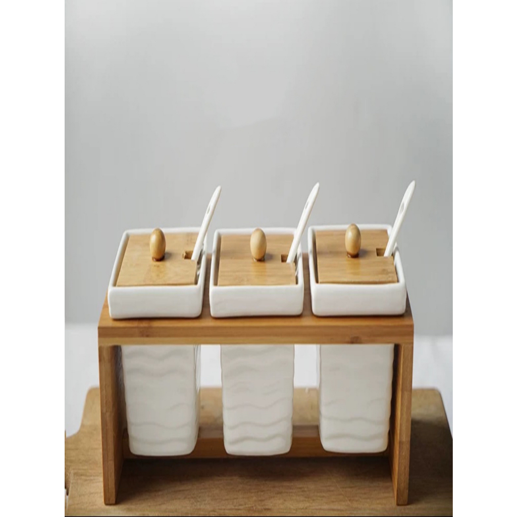 Kit Com 3 Peças Porta Mantemento em Cerâmica com Suporte de Bambu colher de bambu