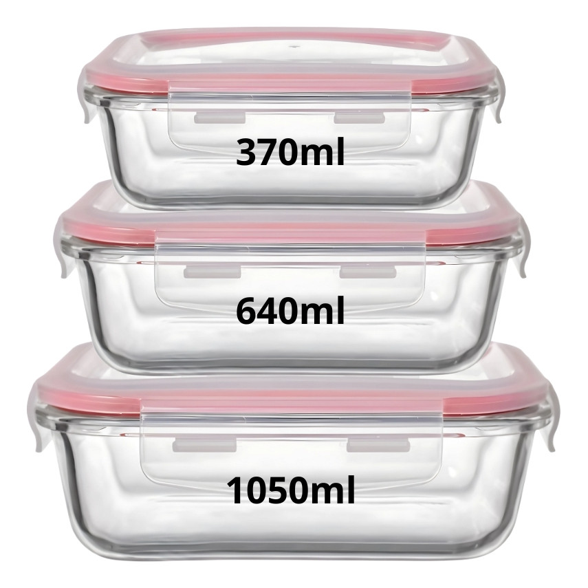 KIT COM 3 POTES HERMÉTICO RETANGULAR DE VIDRO BOROSSILICATO 370ml 670ml 1050ml