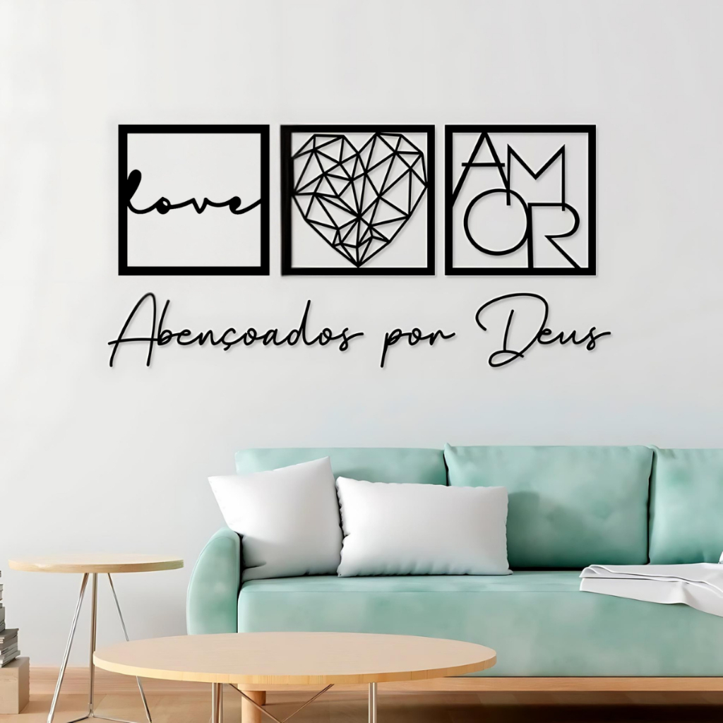 DESCRIÇÃO Conjunto decorativo em MDF com recorte a laser, composto por 3 quadros verticais com design moderno e a frase "Abençoados por Deus". Ideal para decorar salas, quartos, escritórios ou qualquer ambiente que você deseje deixar mais elegante, acolhedor e cheio de significado. Produzido em MDF de 3mm na cor Preto Fosco, com tinta ecológica, sem cheiro, oferecendo beleza e segurança para sua casa. MEDIDAS DO PRODUTO Cada quadro: 60cm (altura) x 20cm (largura) Frase "Abençoados por Deus": 10cm (altura) x 70cm (largura) (aproximadamente) Contém 3 quadros + frase Kit completo pronto para aplicação! ATENÇÃO A frase "Abençoados por Deus" pode ser enviada em partes para garantir a integridade durante o transporte. A montagem é simples e o encaixe é perfeito. Enviamos com fita dupla face 3M original, facilitando a aplicação sem necessidade de furar a parede. Somos fabricantes! Prezamos pela qualidade, envio rápido e o melhor custo-benefício do mercado. ACOMPANHA Fita Dupla Face 3M Original Manual simples de instalação INSTALAÇÃO Aplicação rápida e prática com fita dupla face 3M (inclusa) Indicado para paredes lisas, limpas e foscas Para superfícies com textura ou brilho, recomendamos o uso de pequenos pregos INFORMAÇÕES TÉCNICAS Material: MDF Premium Espessura: 3mm Acabamento: Preto Fosco Durabilidade: 5 anos ou mais Fundo: Produto vazado (sem fundo) Corte: A laser, com bordas lisas e acabamento de alta qualidade LIMPEZA Utilize pano úmido Evite produtos abrasivos EMBALAGEM Embalado com proteção reforçada para chegar até você com total segurança