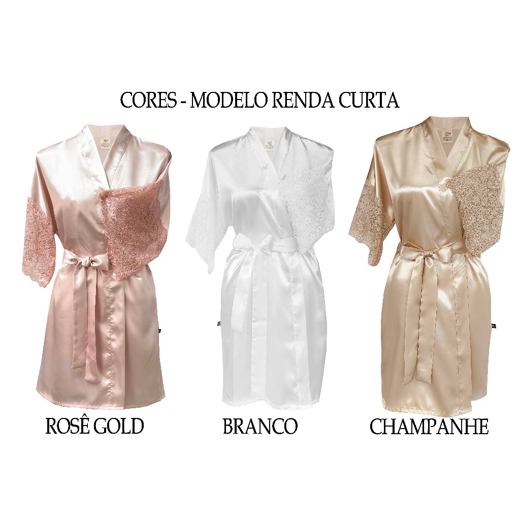 Valor referente a 3 robes – 1 manga LONGA de renda e 2 manga CURTA de renda. Cores Disponíveis: Para o Robe de manga LONGA de renda – Branco e Rosê gold Para o Robe de manga CURTA de renda – Branco e Champanhe Escolher pelo Chat a cor do robe, tamanho, escrita e cor da escrita * O desenho da renda pode variar. (VÁLIDO PARA OS TAMANHOS P, M,G,GG). Vale para seguintes frases: Noiva, Madrinha, Debutante, Mãe da Noiva, Irmã da Noiva, Prima da Noiva, Tia da Noiva, Avó da Noiva, Irmã do Noivo, Daminha, Mãe da Debutante (consultar outras disponibilidades) Nossos robes são fabricados com cetim e rendas de alta qualidade, muito macios e confortáveis. PRODUTO NACIONAL, FABRICAÇÃO PRÓPRIA, TEMOS PREÇO ÓTIMOS E QUALIDADE. Super elegante, bonito e confortável , é ideal para dia de noiva, sendo muito prático na hora mais importante em que se prepara para o dia mais especial da sua vida. ======================================================================== Tamanhos: P: veste 36-38 M: veste 40-42 G: veste 44-46 GG: veste 48-50 ======================================================================== INFORMAÇÕES IMPORTANTES: Cálculo de frete é feito automaticamente no próprio anúncio! Qualquer dúvida, estamos à disposição, pode nos perguntar pelo “CHAT”. ========================================================================