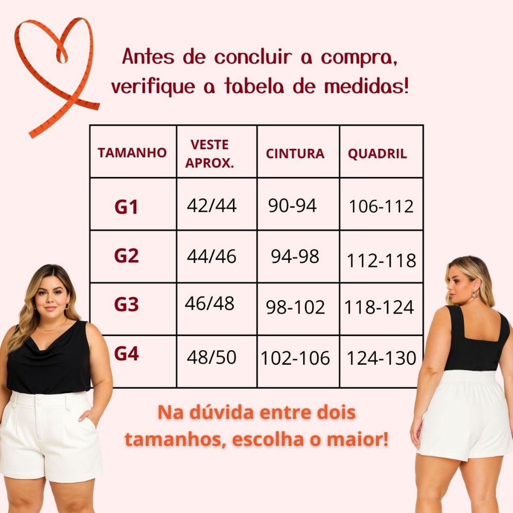SHORT DE ALFAIATARIA PLUS SIZE – Do G1 ao G4 Elegância, conforto e caimento impecável! Nosso short plus size de alfaiataria foi pensado para valorizar suas curvas com sofisticação. Possui modelagem estruturada, cintura alta, pregas frontais, bolsos funcionais. Ideal para compor looks casuais, sociais ou até mais arrumadinhos para o trabalho. Para escolher o tamanho ideal, é muito importante conferir as medidas abaixo: Medidas aproximadas por tamanho: G1 veste 42/44 – Cintura 90-94 cm | Quadril 106-112 cm G2 veste 44/46 – Cintura 94-98 cm | Quadril 112-118 cm G3 veste 46/48 – Cintura 98-102 cm | Quadril 118-124 cm G4 veste 48/50 – Cintura 102-106 cm | Quadril 124-130 cm Se estiver em dúvida entre dois tamanhos, escolha o maior.
