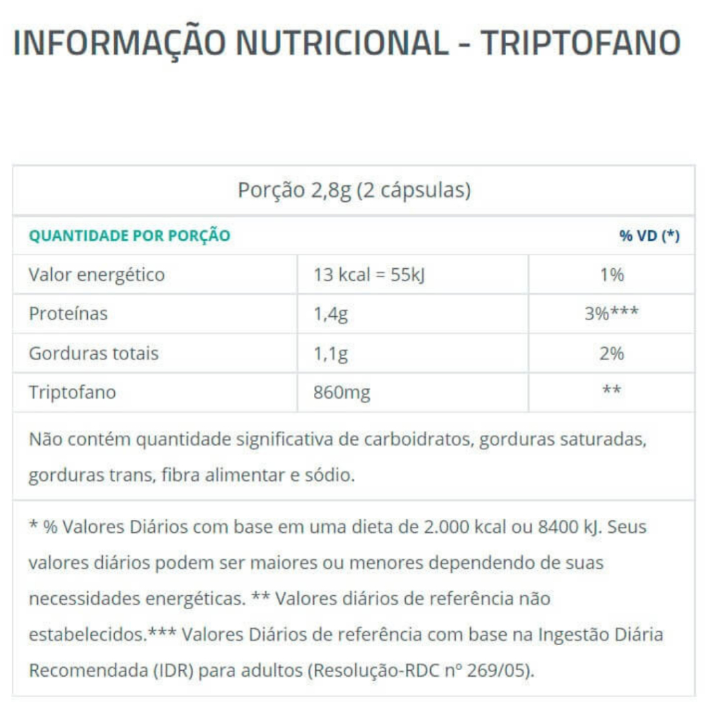 Kit com 3 Triptofano 860mg 60 cáps- Catarinense O triptofano é a base para a produção de diversas moléculas neuroativas como a serotonina e a melatonina. O triptofano (TRP) é um aminoácido essencial, ou seja, não é sintetizado pelo organismo, e, portanto, precisa ser obtido na dieta, e está presente na grande maioria dos alimentos. Cerca de 90% do TRP ingerido encontra-se ligado à albumina do plasma, e apenas 10% é encontrado na forma livre na circulação sanguínea¹. Os neurotransmissores são formados a partir de aminoácidos, vitaminas e cofatores minerais². SUPLEMENTO ALIMENTAR DE TRIPTOFANO EM CÁPSULA Ingredientes: Óleo de Girassol, L-Triptofano e Água Purificada; Gelificante: Gelatina (INS 428), Umectante Glicerina (INS 422) e Corantes: Dióxido de titânio (INS 171), Azul brilhante FCF (INS 133) e Vermelho 40 (INS 129). ALÉRGICOS: PODE CONTER DERIVADOS DE SOJA E PEIXE. NÃO CONTÉM GLÚTEN. Ingestão diária recomendada: 2 cápsulas antes de dormir