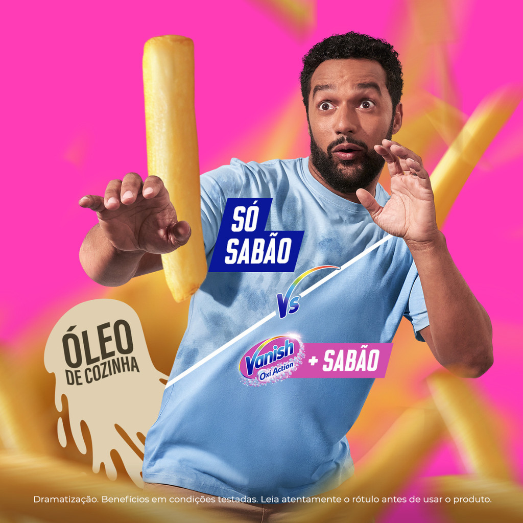 Vanish Oxi Action é o potencializador de lavagem em pó, sem cloro, que higieniza, tira manchas, neutraliza odores das roupas coloridas, sem esforço. Fórmula com poder Oxi previne a transferência de cores e limpa profundamente suas roupas coloridas.