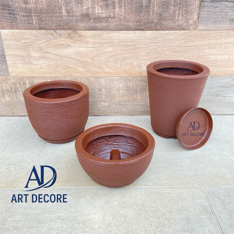 Kit Com 3 Vasos Decorativo de Planta Escovado Polietileno Com Prato Cone + Bojo + Bacia