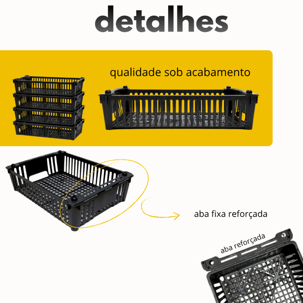 Kit 30 Caixas e Cestos Organizadores Plásticos Empilháveis Reforçados – Armazenamento, Transporte e Estoque O Kit com 30 Caixas e Cestos Organizadores Plásticos é a solução completa para quem busca armazenar, transportar e organizar produtos com segurança. Produzidas em plástico reforçado e durável, essas caixas e cestos empilháveis são ideais para uso profissional e doméstico. Com design robusto e estrutura resistente, mantendo o conteúdo protegido contra impactos e umidade. O formato empilhável otimiza espaço, facilitando a organização em estoques, depósitos, comércios, oficinas, residências e transportadoras. Características do Produto Kit com 30 caixas e cestos organizadores plásticos reforçados Material resistente a impactos, peso e variações de temperatura Estrutura empilhável para otimização de espaço vertical Formato versátil: pode ser usado como caixa organizadora ou cesto plástico Fácil higienização e reutilização múltiplas vezes Indicado para uso interno e externo Aplicações Recomendadas Estoques, armazéns e centros de distribuição Organização de peças, ferramentas, roupas, mercadorias e insumos Transporte de produtos de forma segura Organização de alimentos, frutas, verduras e produtos de hortifruti Uso em oficinas, lojas, mercados e indústrias Usado como organizador de geladeiras e freezer Benefícios Principais Melhora a organização e o acesso aos produtos Reduz riscos de danos durante transporte e armazenamento Permite empilhamento seguro, aproveitando ao máximo o espaço disponível Versátil para diferentes setores e finalidades Invista no Kit 30 Caixas e Cestos Organizadores Plásticos Empilháveis Reforçados e tenha mais praticidade, segurança e eficiência na organização e transporte de seus produtos.