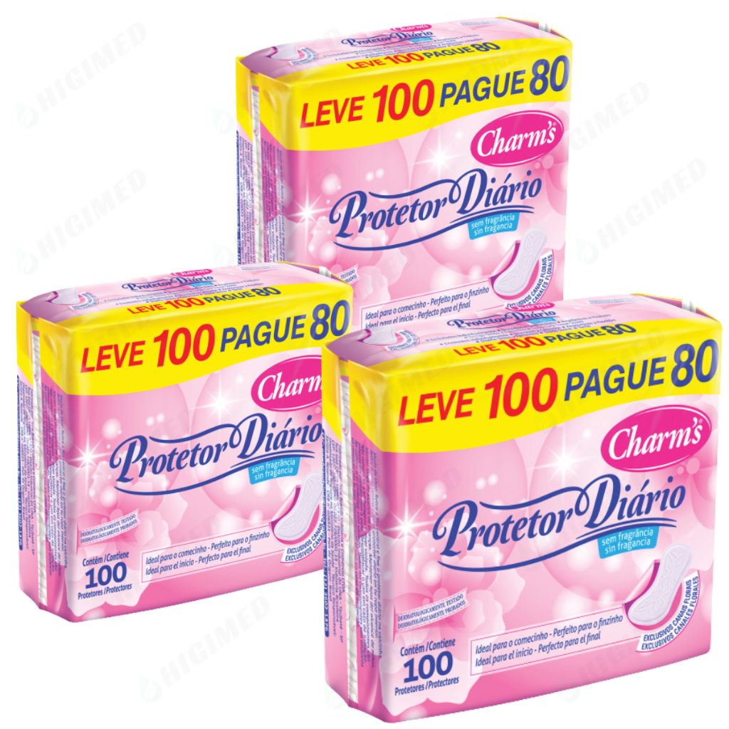 Este kit contem 3 pacotes de Protetor Diário com 100 unidades cada, sendo o total de 300 unidades. Protetor Diário Charm's. Proteção para o dia a dia. Dermatologicamente testado. Sem fragrância. Exclusivos Canais florais. Embalados individualmente, discretos e confortáveis, anatômicos e flexíveis, design único e feminino, cobertura toque suave. 3 Embalagens com 100 unidades cada.