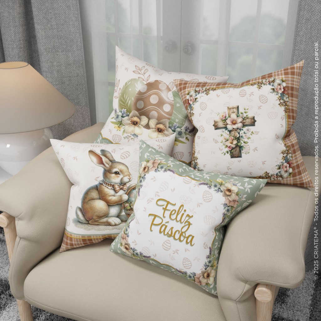 KIT 4 CAPAS DE ALMOFADA EM TECIDO PARA PÁSCOA 45x45cm Nossas capas de almofada são a escolha ideal para trazer o encanto da Páscoa à sua decoração! Com cores vibrantes e estampas exclusivas, elas adicionam charme e aconchego ao ambiente, tornando sua casa ainda mais especial para a celebração. >> DICAS DE USO: Perfeitas para renovar a decoração da sala, quarto ou qualquer ambiente. >> ITENS INCLUSOS: ✔ 4 Capas de almofada em tecido sublimado >>> TODOS OS PRODUTOS NÃO ACOMPANHAM ENCHIMENTOS OU OBJETOS DECORATIVOS <<< >> FICHA TÉCNICA: ✔ Tecido Oxford ✔ Tecido grosso e com alta durabilidade ✔ Gramatura: 140 g/m de excelente qualidade ✔ Composição do Tecido: 100% Poliéster ✔ Acabamento impecável com costura reforçada ✔ Fechamento em zíper >> BENEFÍCIOS: • Não desbota, pode ser lavado quantas vezes desejar • Secagem rápida • Pode ser passado a ferro com a temperatura morna (de morno para frio) • INFORMAÇÃO COMPLEMENTAR: As cores podem variar, devido às configurações brilho e contraste do monitor ou celular onde a imagem está sendo visualizada, também podem dar a impressão das cores serem mais ou menos vivas, mais ou menos intensas. >>>>>>>>>>>>>>>>>>>>>>>>>>>>>>>>>>> DÚVIDAS FREQUENTES: ACOMPANHA MESA E ELEMENTOS DECORATIVOS? Não acompanha elementos decorativos, vendemos somente a capa de almofada em tecido. TRABALHAM COM PERSONALIZAÇÃO? Não! Nós optamos para uma melhor eficiência no processo de postagem do pedido, com isso trabalhamos com produtos prontos. QUANDO É FEITO O ENVIO? Trabalhamos com produtos à pronta entrega, comprando e sendo aprovado o pagamento no dia (PIX, CARTÃO DE CRÉDITO ou DÉBITO) o envio é feito em até 24h úteis. POSSUI GARANTIA? Nosso produto possui garantia contra defeito de fabricação. PRODUTO COM NOTA FISCAL? Todos os produtos acompanham nota fiscal. >>> Tem alguma dúvida antes de finalizar sua compra? Envie uma mensagem para nós que ajudaremos você! <<<