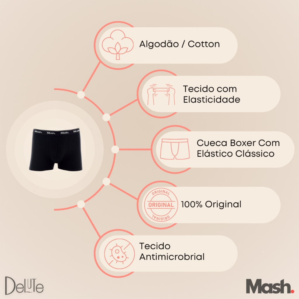 Kit com 4 Cuecas Boxer Cotton Mash Ref. 110.15 Atenção: O kit será composto com 4 cuecas que serão enviadas de acordo com estoque disponivel de maneira sortida Adquira o conforto e a qualidade que você merece com o nosso Kit composto por 4 cuecas modelo boxer da Mash. Confeccionadas em cotton, uma combinação de algodão com elastano, essas cuecas proporcionam maior elasticidade e ajuste perfeito ao corpo, garantindo bem-estar durante todo o dia. Características: - Elástico de 4 cm: Cintura com elástico repetitivo e padrão consagrado da Mash, oferecendo suporte firme e confortável. - Modelagem Boxer Curta: O modelo mais usado atualmente, combinando design discreto e moderno. Tecido Macio e Maleável: Confecção em 95% algodão e 5% elastano, que se molda ao corpo com muito conforto. Tamanhos Disponíveis: P: Veste do 38 ao 40 M: Veste do 42 ao 44 G: Veste do 46 ao 48 GG: Veste do 50 ao 52 Cores e suas respecitivas composição: Cinza chumbo, Preta, Azul Marinho, Azul Jeans e Branca, Verde: - 95% Algodão e 5% Elastano Cinza Mescla: - 84% Algodão - 4% Elastano - 12% Poliéster Cinza Mescla Escuro: - 46% Algodão - 4% Elastano - 48% Poliéster Benefícios: Ajuste Perfeito: Graças à combinação de algodão e elastano, as cuecas se adaptam ao seu corpo, oferecendo maior liberdade de movimento. Ótimo Custo-Benefício: Adquira 4 cuecas de alta qualidade por um preço especial. Aproveite essa oportunidade e garanta já o seu kit de cuecas boxer Mash, com o melhor da qualidade e conforto que só a Mash pode oferecer!