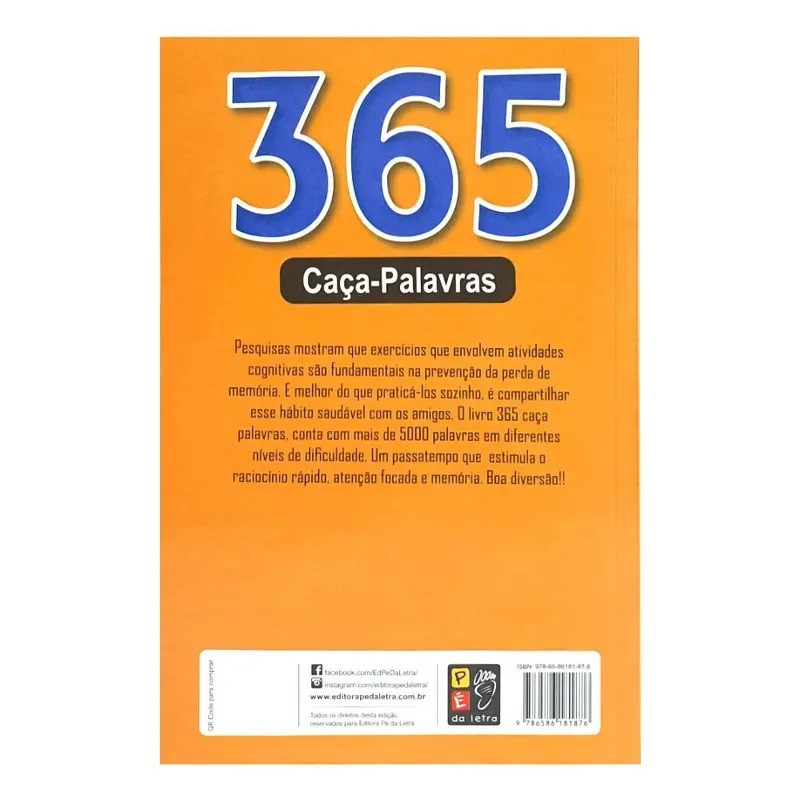 O livro 365 caça palavras, conta com mais de 5000 palavras em diferentes níveis de dificuldade. Um passatempo que estimula o raciocínio rápido, atenção focada e memória. As respostas você encontra por meio do aplicativo que se encontra no livro. Boa diversão! 14x21cm 368 Palavras