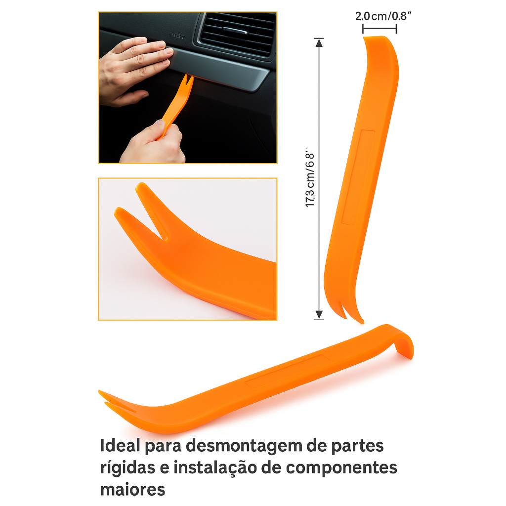 Kit com quatro espátulas plásticas ideais para remoção de painéis, forros, portas, molduras e frisos automotivos sem danificar o acabamento. Ferramentas leves, resistentes e versáteis, perfeitas para quem trabalha com som automotivo, funilaria, estética ou manutenção veicular. Facilite o serviço com mais agilidade e proteção às peças do carro. Características: • Quatro modelos diferentes de espátulas • Material plástico durável e não agressivo • Ideal para desmontagem de painéis, forros e frisos • Não risca e nem danifica a lataria ou acabamento interno • Indicado para uso profissional ou doméstico