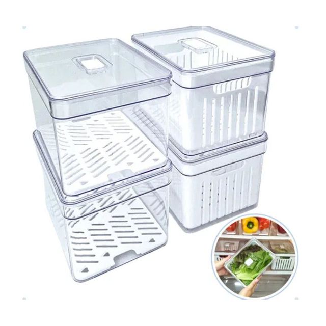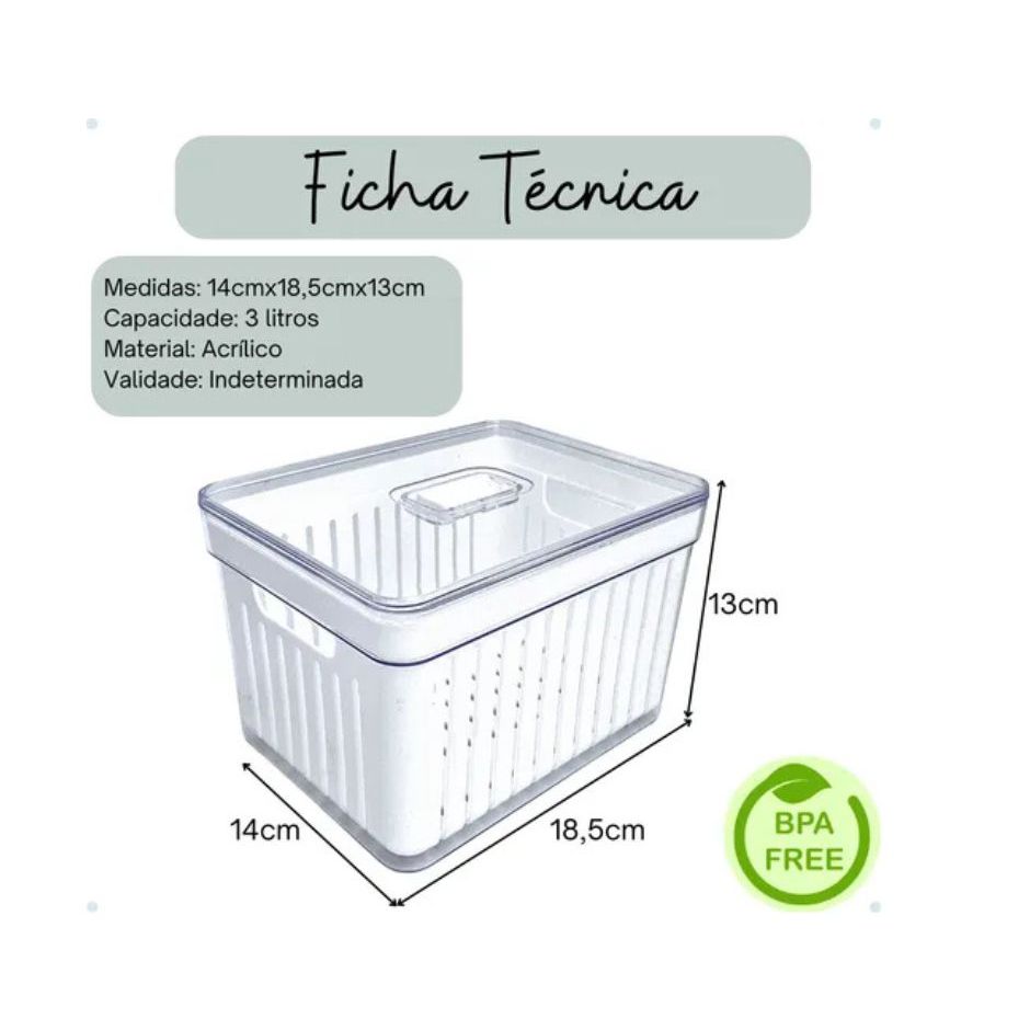 Apresentando a vocês: Kit com 4 Organizadores de Geladeira: 2 Organizadores com Cesto de Drenagem e Tampa com Controle de Ventilação - 3 LITROS. 2 Organizadores com Tela e Tampa com Controle de Ventilação - 3,8 LITROS. *********************************** Uma revolução na forma de armazenar verduras, legumes e frutas na geladeira! Quantas vezes você já teve que jogar fora verduras e legumes porque quando foi usar estavam estragados? Quanto tempo você gasta para preparar uma salada tendo que higienizar tudo na hora? Uma boa higienização leva tempo e ela é essencial para evitar muitos riscos a nossa saúde e da nossa família. Os organizadores de geladeira foram especialmente desenvolvidos para promover o frescor prolongado de verduras, frutas e legumes, mantendo uma rotina sem desperdícios. Ao armazenar os alimentos já limpos e higienizados você terá muita praticidade e vai economizar muito tempo no preparo das refeições. Empilhe, encaixe e enxergue facilmente os alimentos armazenados na geladeira, mantendo tudo em ordem. *********************************** ENVIA AINDA HOJE? R: Temos todos os produtos em estoque e em no máximo 24 horas úteis seu pedido já estará com a transportadora. QUAL A CAPACIDADE? E O TAMANHO? R: Com Cesto: 3 LITROS. Medidas: L 14cm x C 18,5cm x A 13cm. Com Tela: 3,8 LITROS. Medidas: L 14cm x C 18,5cm x A 13cm. Os potes são do mesmo tamanho, a capacidade é diferente porque mede o volume interno com o cesto e com a tela. COMO USAR A VÁLVULA DE CONTROLE DE VENTILAÇÃO? R: Para alimentos sensíveis como folhas ou vegetais que murcham, utilize a válvula fechada, exemplos: Alface, Rúcula, Beterraba, Brócolis, Couve, Repolho, Cenoura, Couve-flor, Couve, Berinjela. Alimentos cortados sempre utilizar com a válvula fechada. Para frutas ou vegetais com casca, utilize a válvula aberta, exemplos: Maçã, Manga, Abacate, Tomate, Melão, Laranja, Pêssego, Melancia, Pêra, Pepino, Pimenta, Ameixa, Uvas, Kiwi; PODE SER COLOCADO NA LAVA-LOUÇAS? R: Não deve ir à lava-louças, nem ao freezer ou ao micro-ondas. A limpeza é bem simples, lave com sabão neutro e esponja macia (parte amarela), evitando produtos abrasivos no processo de limpeza. EMITEM NOTA FISCAL? R: Sim! Todos os nossos produtos acompanham Nota Fiscal Eletrônica. A Nota Fiscal é emitida automaticamente pelo sistema do Mercado Livre, com os dados cadastrados no momento da compra. *********************************** Benefícios: > Praticidade e agilidade no preparo de refeições; > Alimentos frescos por mais tempo; > Menos desperdício de comida, mais economia; > Super transparência para enxergar o conteúdo e manter tudo em ordem; > Empilhável, facilita a organização e otimiza o espaço da geladeira; > Tampa com ventilação ajustável para cada tipo de alimento; > Com cesto de drenagem, evita que os alimentos fiquem molhados após a lavagem. *********************************** Ficha Técnica: Medidas: L 14cm x C 18,5cm x A 13cm Capacidade: com Cesto 3 LITROS e com Tela 3,8 LITROS Material: Acrílico BPA Free: Livre de BPA Validade: Indeterminada *********************************** O que você vai receber? Um kit com 4 Organizadores: 2 Organizadores de Geladeira com Cesto de Drenagem e Tampa com Controle de Ventilação - 3 LITROS. 2 Organizadores de Geladeira com Tela e Tampa com Controle de Ventilação - 3,8 LITROS. **ATENÇÃO** Você vai receber os produtos exatamente iguais as fotos, com as mesmas dimensões e capacidade anunciados aqui. Encontramos muitos anúncios onde os vendedores anunciam com um tipo de produto nas fotos e enviam outro modelo. Fique tranquilo, somos profissionais e entregaremos tudo conforme anunciado. *********************************** INSTITUCIONAL: Nosso objetivo é entregar de forma ágil e profissional produtos de qualidade. Trabalhamos sempre para superar as expectativas de nossos clientes e fazer com que eles tenham uma experiência única. AGILIDADE: Trabalhamos somente com produtos em estoque. O prazo máximo para o envio do pedido é de 24 horas úteis, mas nosso objetivo é fazer o envio no mesmo dia, sempre que possível. *********************************** Qualquer dúvida deixe sua pergunta! Agradecemos por sua atenção.