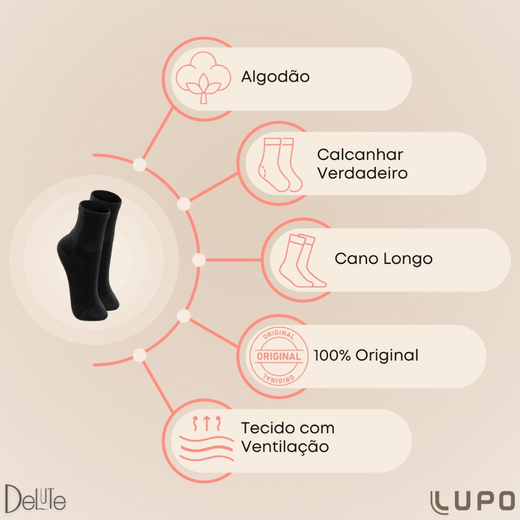 Kit 4 Pares De Meias Cano Médio Infantil Lupo Ref . LP2727 Kit de 4 Pares de meias Lupo Sport, confeccionadas em algodão penteado super macio e confortável. Cano médio, adornadas por logotipo da marca punho canelado com calcanhar verdadeiro, com isso, evitando que a meia saia do lugar durante o uso. Possui tecnologia atoalhada, o que facilita a absorção do suor diminuindo o odor nos pés. Excelente custo benefício na compra do kit. O bico e o calcanhar foram reforçados para maior conforto e durabilidade, costuras firmes, interior respirável e macio. - Calcanhar verdadeiro. - Ajuste perfeito. - Maior conforto. - Punho soft. Composição Outras Cores: 74% Algodão, 24% Poliamida e 2% Outras Fibras Cinza: 65% Algodão, 24% Poliamida, 9% Poliéster e 2% Outras Fibras Descrição da Marca Lupo é uma das maiores e melhores fabricantes de moda íntima e meias. Em 1947 a empresa já era o maior fabricante de meias masculinas do Brasil, a partir de 1990 a Lupo ampliou sua linha de produtos, e hoje é uma das marcas mais conhecidas neste ramo.