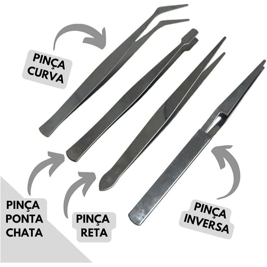 - KIT DESENVOLVIDO PARA MANIPULAÇÃO DE PEQUENAS PEÇAS. - CONTA COM 4 PINÇAS EM FORMATOS DIFERENTES, PODENDO MANUSEAR VÁRIOS OBJETOS DIFERENTES. - CORPO COM RANHURAS TORNANDO A FERRAMENTA MAIS ADERENTE PARA SE SEGURAR. - CONTÉM 4 PEÇAS: • 1 PINÇA RETA • 1 PINÇA CURVA • 1 PINÇA CHATA • 1 PINÇA INVERSA • MEDIDAS APROXIMADAS: - ALTURA: 12 CM. - LARGURA: 1 CM.