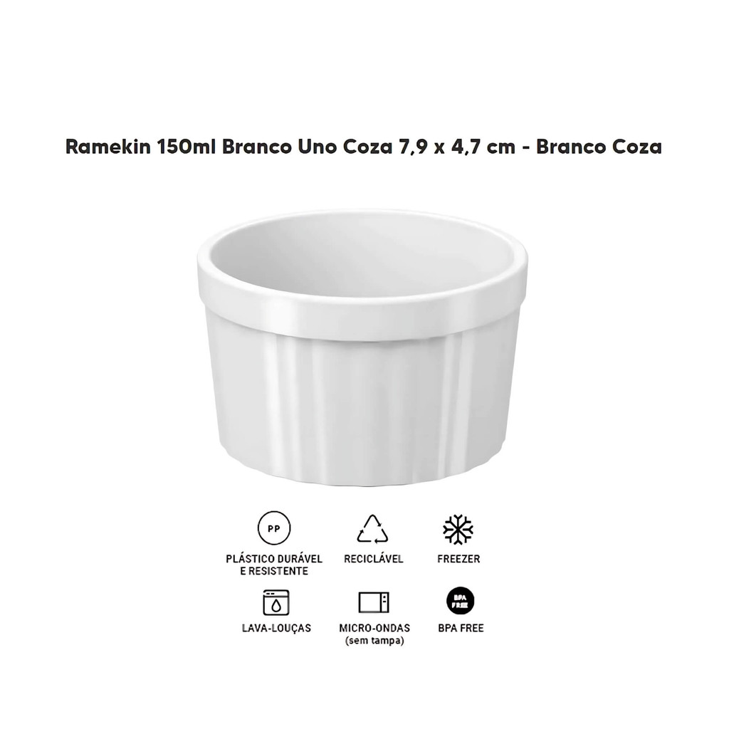 Este ramekin branco 150ml da linha Uno é perfeito para surpreender no momento de servir! Com seu design sofisticado em formato circular e com a parte de fora canelada, essa pequena tigela é ideal para servir geleias e molhos como maionese, ketchup, chimichurri ou vinagrete. Muito versátil, esta tigela bowl é desenvolvida em plástico polipropileno com design clean e elegante, combinando facilmente com outros componentes sem interferir na apresentação da mesa. - Dimensões: 7,9cm (D) x 4,7cm (A); - Peso: 36g - Capacidade: 150ml; - Material: polipropileno (PP). Limpeza e cuidados: - Lavar com água, detergente neutro e uma esponja macia para conservar a peça; - Pode ser levado à geladeira, ao freezer e à máquina de lava-louças; - Nunca leve ao fogão, forno convencional e nem ao micro-ondas; - Seu uso é indicado para a etapa de servir alimentos prontos; - Não usar produtos abrasivos. Características: - Marca:Brinox - Modelo:10162/0007 *Imagens Meramente Ilustrativas* Conteúdo da Embalagem: - 04 tigelas ramekin uno 150ml branco Brinox tigela - itens de cozinha - item de cozinha - utensilios para cozinha - utensílio para cozinha - tigelas