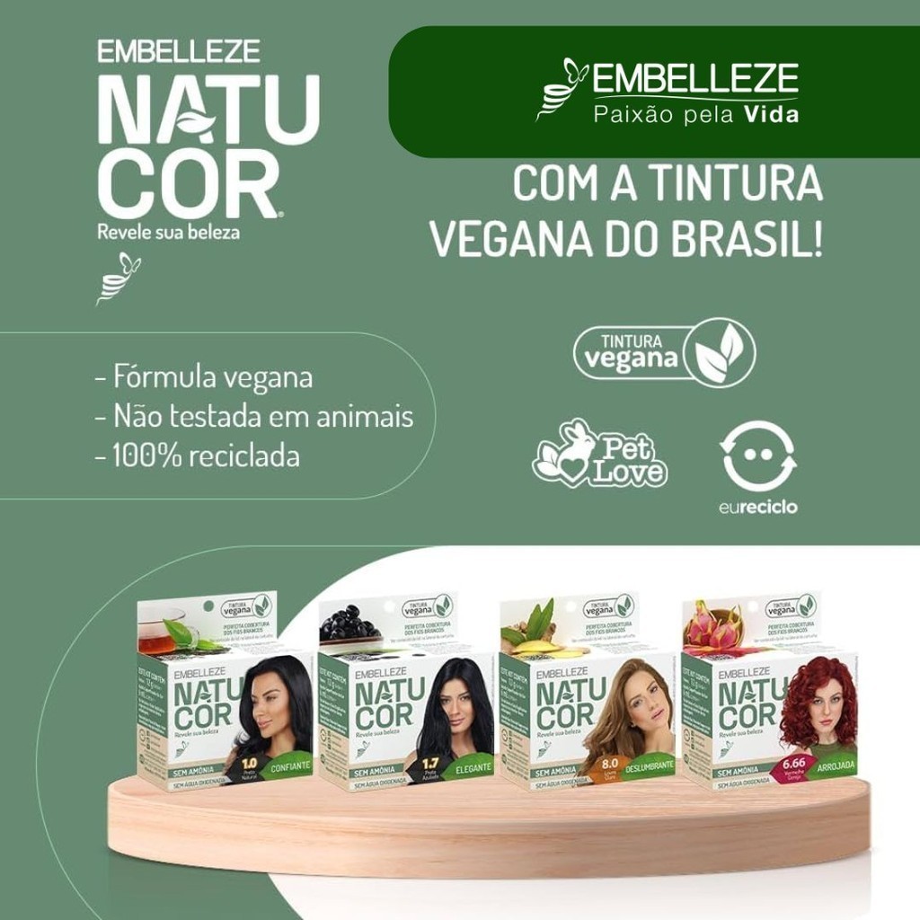 Natucor é tão suave que basta misturar Natucor com água potável para pintar os fios naturalmente, sem agredi-los. Uma tinta de cabelo única, sem água oxigenada, sem amônia e sem chumbo, que utiliza nutrientes de ervas, flores e frutos. Sua maneira mais natural de dar vida a uma nova mulher. Perfeita cobertura dos fios brancos. Compatível com químicas, incluindo henê. Ideal para fios fragilizados e sensíveis. Ótimo para um banho de brilho. Fórmula Vegana; Sem chumbo; Sem amômia;