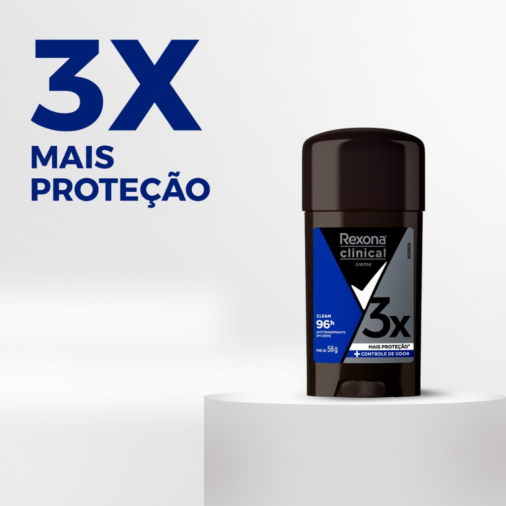 Kit com 4un Desodorante Antitranspirante Stick Rexona Clinical Clean 58g A transpiração e o mau odor podem ser um empecilho na vida de muitas pessoas, o sentimento de desconforto toma conta nessas situações. Pensando nisso, Rexona desenvolveu o desodorante Antitranspirante Rexona Clinical em creme, que combina 3x mais proteção* contra transpiração excessiva com ingrediente hidratante para o cuidado da pele. Rexona Clinical possui uma inovadora fórmula termo-ativa e conta com a exclusiva tecnologia TRIsolid, que se adapta ao organismo, ajudando a prevenir a transpiração e o mau odor. O suor e o mau odor podem ser um empecilho na vida de muitas pessoas, o sentimento de desconforto toma conta nessas situações. O Desodorante Antitranspirante Rexona Men Clinical Clean oferece a proteção que você precisa para se sentir sempre seco e refrescado. Para aplicar, basta deslizar na pele das axilas, e estará pronto para começar seu dia. Cada vez mais usamos materiais reutilizáveis em nossas embalagens, e facilitamos o descarte consciente da sua embalagem de desodorante para um planeta em movimento. Toda a linha de desodorantes antitranspirantes Rexona foi desenvolvida com tecnologia de ponta para que você possa desafiar os seus limites diariamente. Não importa se você está escalando uma montanha, fazendo uma apresentação em sua empresa ou indo a um encontro, Rexona garante a melhor proteção contra a transpiração. Produto Original Rexona;