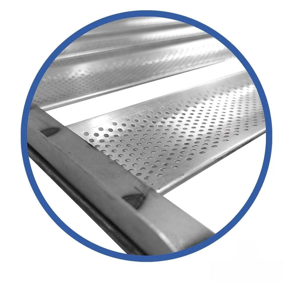 Contém 5 Peças de Assadeira Pão Francês As nossas assadeiras são ideais para o assado e cozimento de Pães em geral use a criatividade, é a escolha perfeita para sua padaria, confeitaria e supermercado. PARA O QUE SERVE AS TIRAS PERFURADAS E QUAIS AS VANTAGENS? Para que os pães fiquem macios por dentro e crocante por fora, a perfuração serve para que o calor do forno a asse por igual. Assim também as funções das tiras permitem que o pão mantenha a sua forma, ficando levemente ondulado. Fabricadas em 100% alumínio da MELHOR QUALIDADE, possui alta resistência e não enferrujam. Dimensões do Produto: 68cm Comprimento x 58cm Largura x 2cm Altura Medidas das Tiras: 7cm Material: Tela em Alumínio / Estrutura Aço Carbono Fabricação Própria Agradecemos desde já o contato. Dúvidas à disposição!