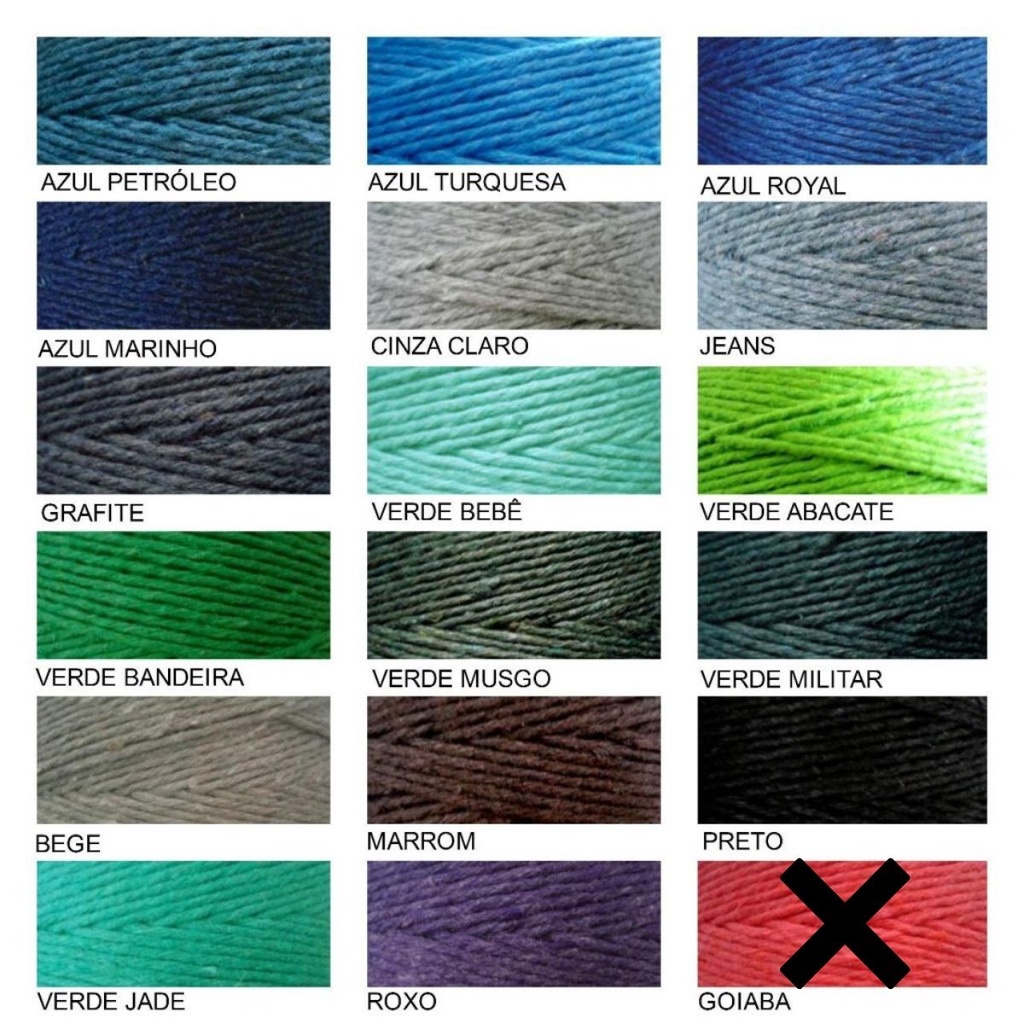 Para escolher as cores por favor visualize nossa tabela nas fotos do anuncio e nos informe através do CHAT as CORES E FIO que deseja imediatamente após a compra. Caso não seja informado, devido nosso tempo para postagem, será enviado cores sortidas. Após Realizar a compra, favor nos comunicar as CORES e nº do FIO para que possamos enviar. Descrição: Excelente Barbante para crochê, Feito com os mais modernos equipamentos, proporcionando assim fios torcidos uniformemente eliminando quase 100% as emendas. Cores firmes e não soltam tinta. 85% Algodão e 15% outras fibras Barbante ecologicamente correto. Fio 4 / 700 gramas / 1100 metros / Crochê 3mm / Tricô 4mm Fio 6 / 700 gramas / 710 metros / Crochê 3,5mm / Tricô 4,5mm Fio 8 / 700 gramas / 510 metros / Crochê 4mm / Tricô 5mm Contando com a maior gama de cores do mercado. OBS: Cores podem sofrer variações de acordo com o lote, e dispositivo utilizado para visualização, portanto adquiram o suficiente para término do trabalho, siga instruções no rótulo do produto.