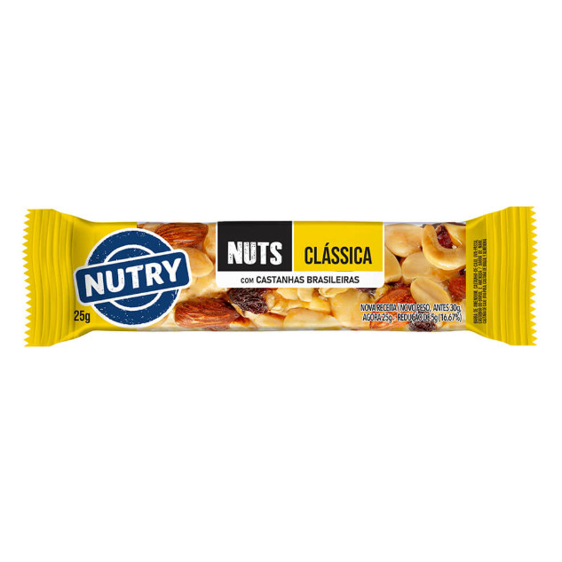 Kit Com 5 Barra De Cereal Nuts Clássica Com Castanhas Brasileiras Nutry De 25g cada.INGREDIENTES: AMENDOIM, MISTURA DE OLEAGINOSAS (CASTANHA-DE-CAJU, AMÊNDOA E CASTANHA-DO-BRASIL), UVA-PASSA, AÇÚCAR, GLICOSE DE MILHO, POLIDEXTROSE, ÓLEO DE GIRASSOL, SAL, ESTABILIZANTES GOMA ACÁCIA E GLICEROL E ANTIOXIDANTES LECITINA E MISTURA CONCENTRADA DE TOCOFERÓIS.ALÉRGICOS: CONTÉM AMÊNDOA, AMENDOIM, CASTANHA-DE-CAJU, CASTANHA-DO-BRASIL E DERIVADOS DE SOJA. PODE CONTER AVEIA, AVELÃ, CENTEIO, CEVADA, LÁTEX NATURAL, LEITE, MACADÂMIA, NOZES, PECÃS, PISTACHE, TRIGO E TRITICALE. CONTÉM GLÚTEN.